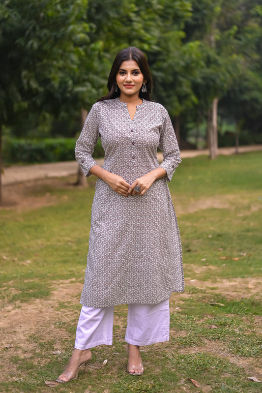 Pastel Grey Geometry Printed Straight Kurta with Pocket