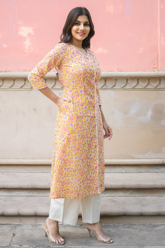 Pastel Yellow Floral Printed A-Line Kurta with Pocket