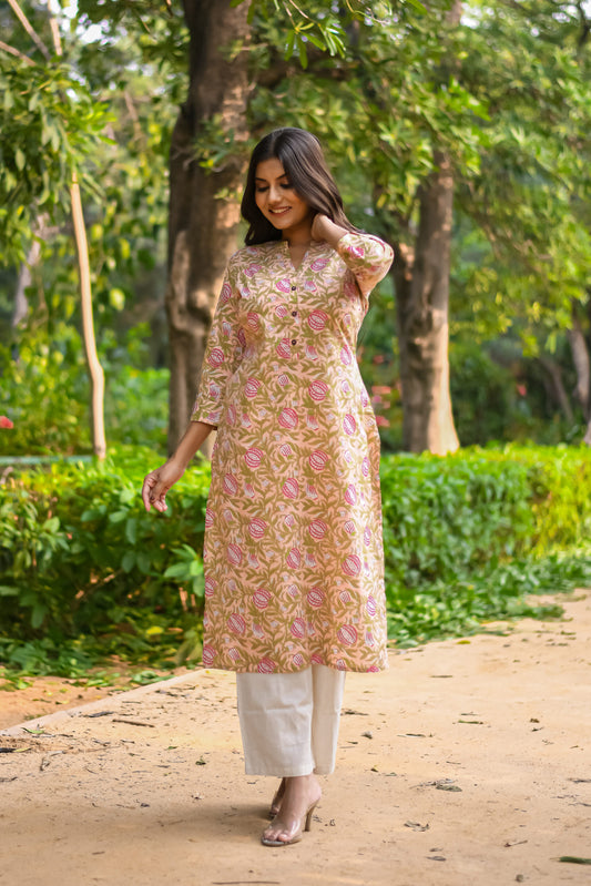 Peach Floral Vine Printed A-Line Kurta with Pocket