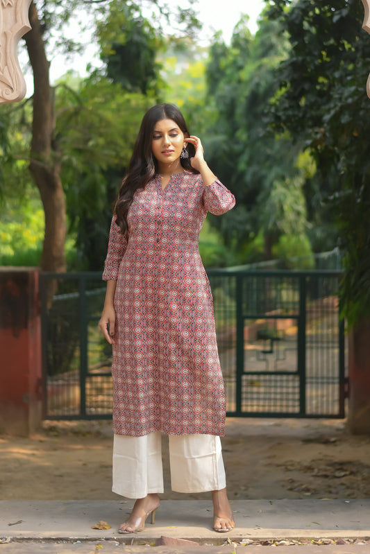 Rust Ajrakh Printed Straight Kurta with Pocket