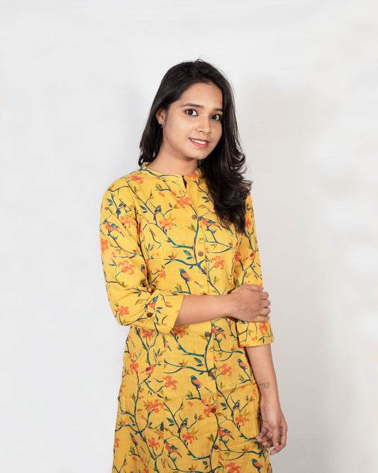 Mustard Yellow Vine Print Kurti with Pocket