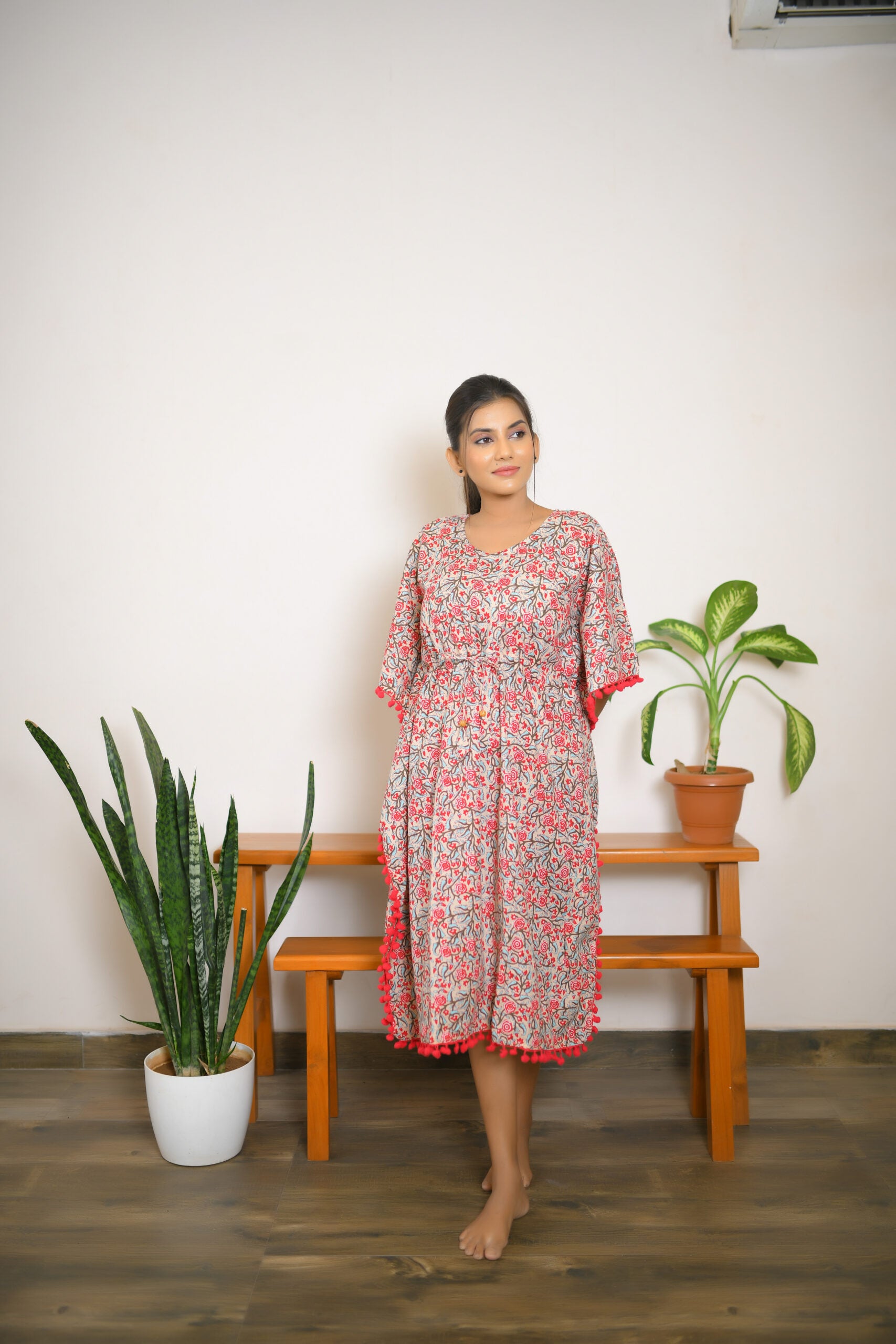 There is nothing as perfect as this Vine Printed Kaftan with Pom Pom lace. This Kaftan is an elegant one-and-done outfit that needs no pairing. Add this short kaftan to your wardrobe and stay ready for vacations or pool parties. The embedded drawstring waist allows it to fit to all unique sizes.
