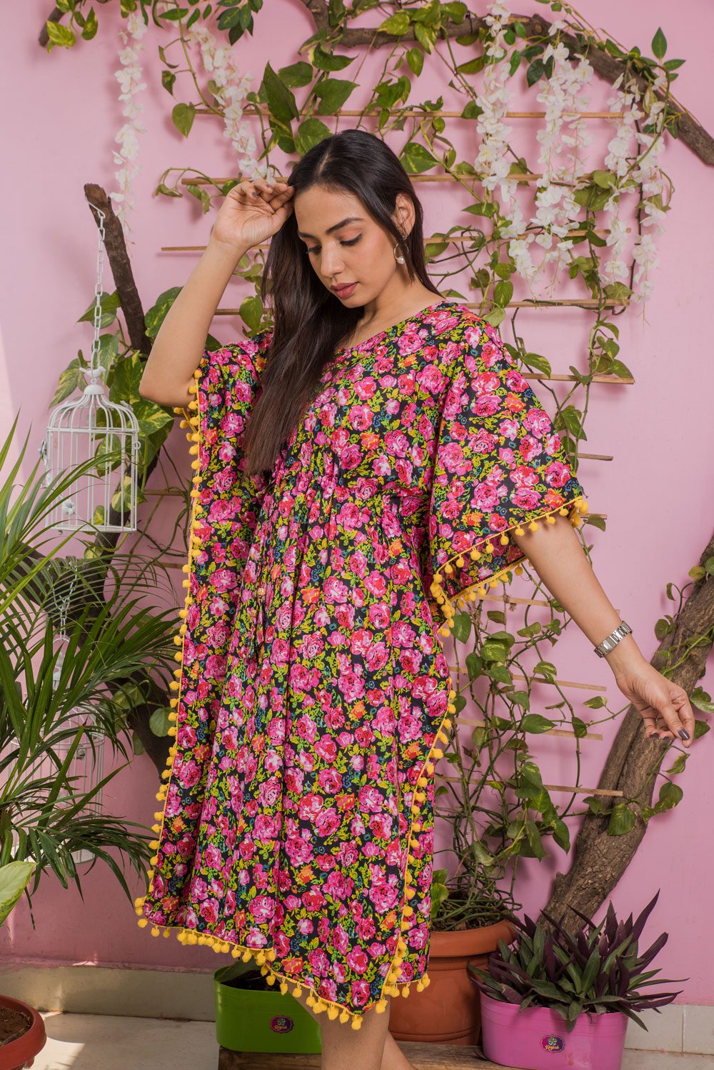Black Floral Print Short Kaftan with Yellow Pom Pom