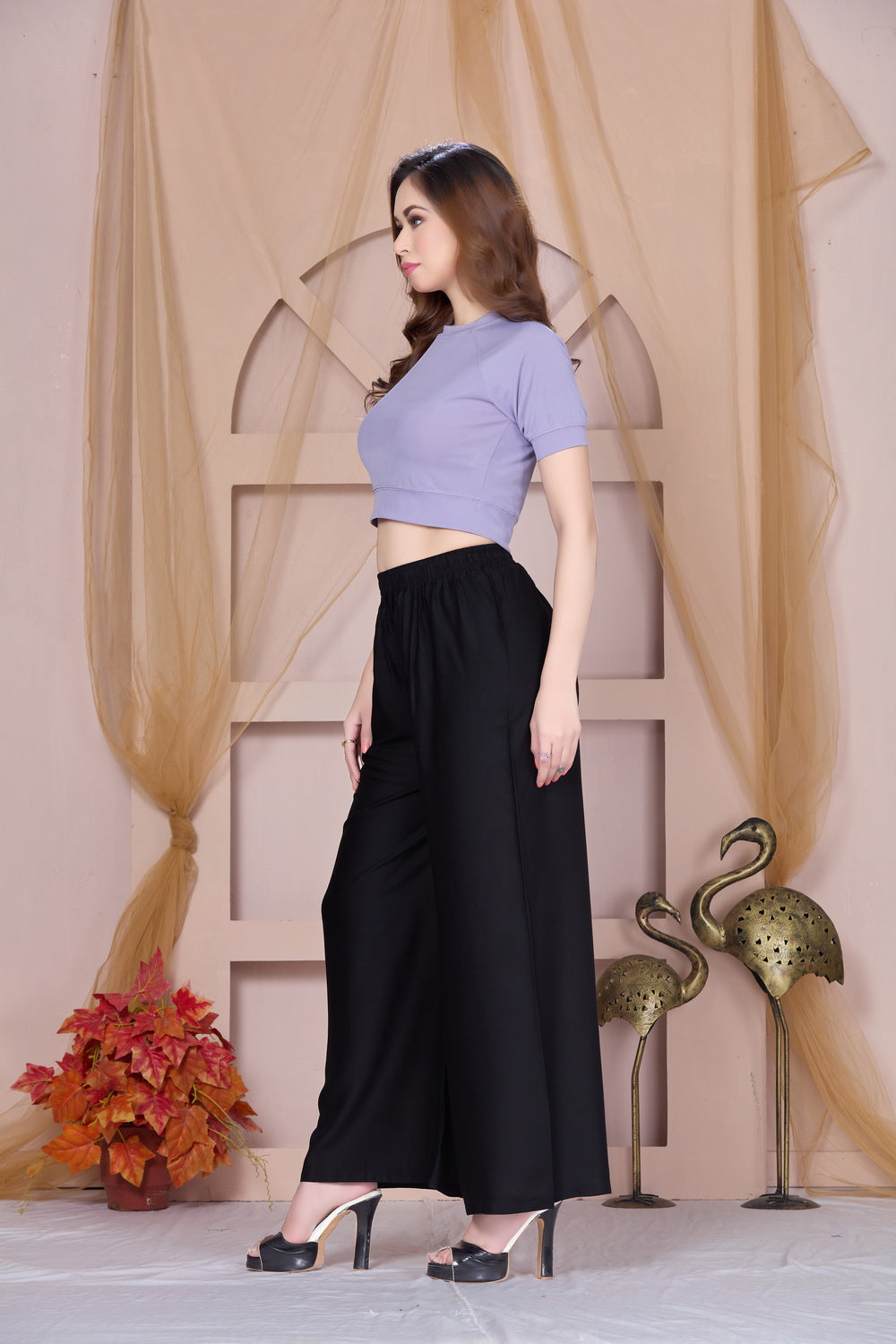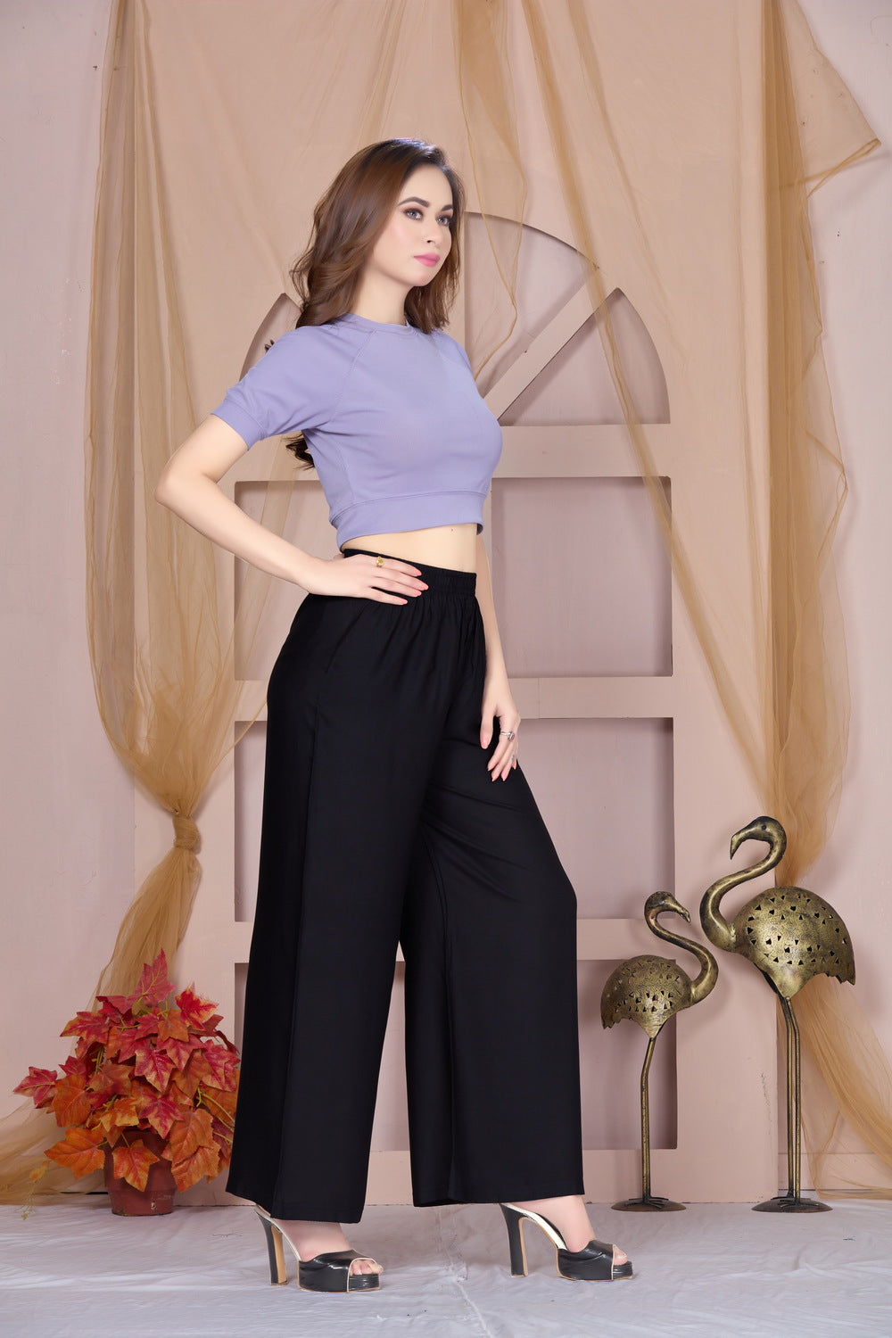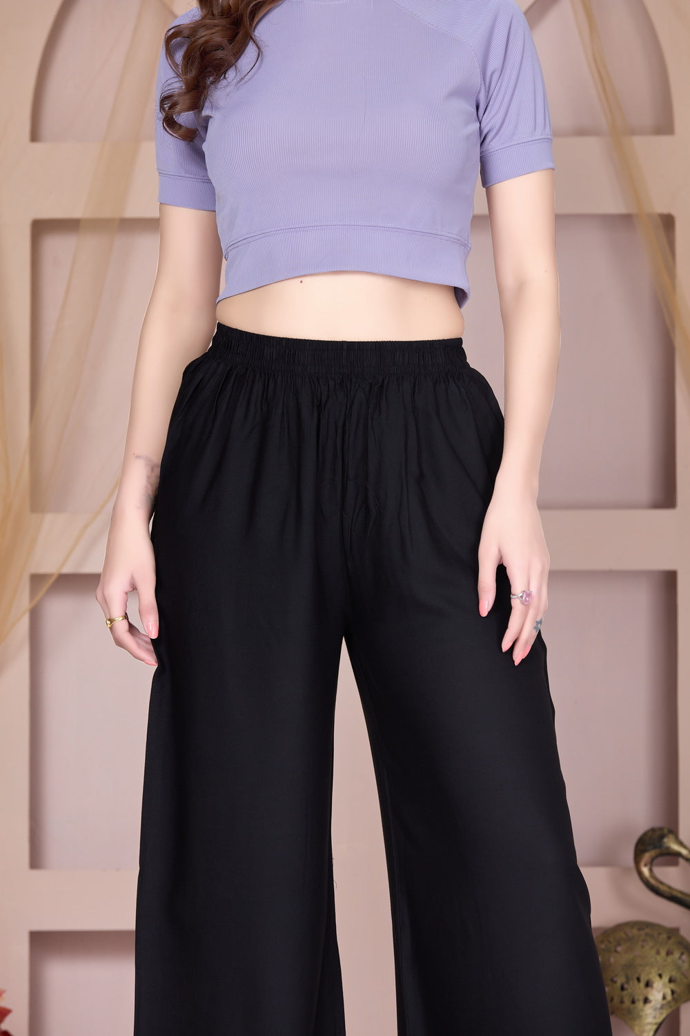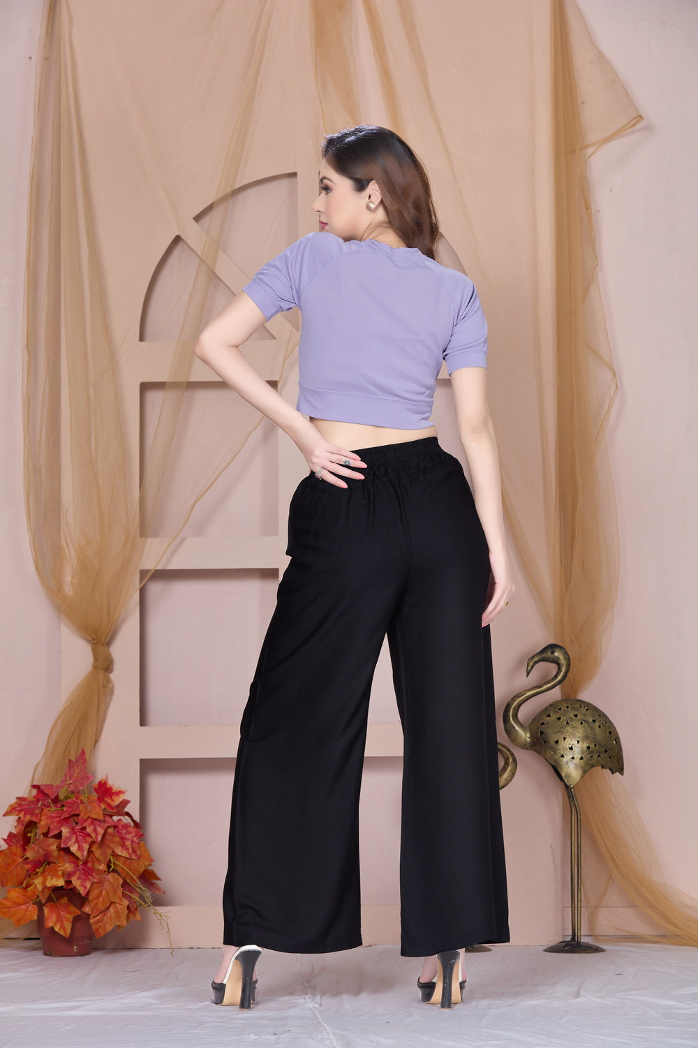 Add effortless style and comfort to your wardrobe with Vivika’s Flared Black Palazzo Pants. Made from 100% soft rayon fabric, these pants feature a classic Black color and a flared, relaxed fit that flatters all body types. The elastic waistband comfortably fits different waist sizes, offering ease of movement and all-day comfort. With an approximate length of 37 to 38 inches and one side pocket for added convenience, these palazzos are perfect for daily wear, work, travel, and festive occasions.