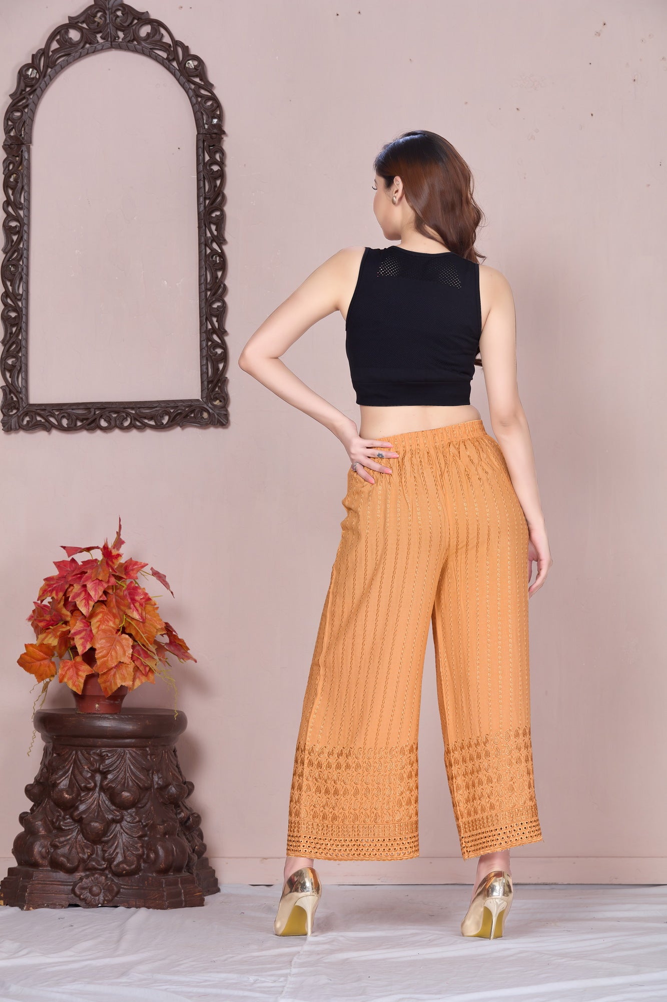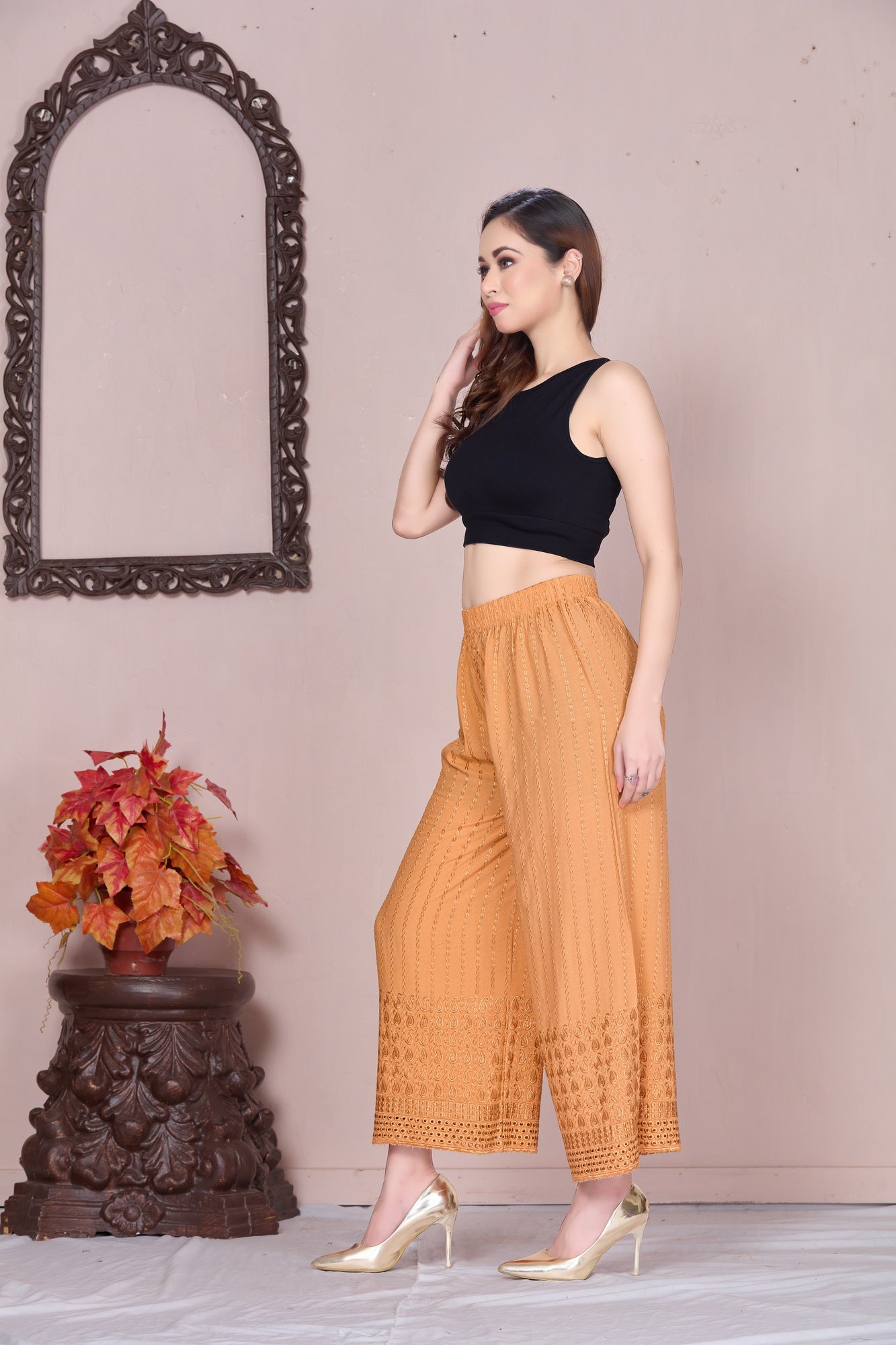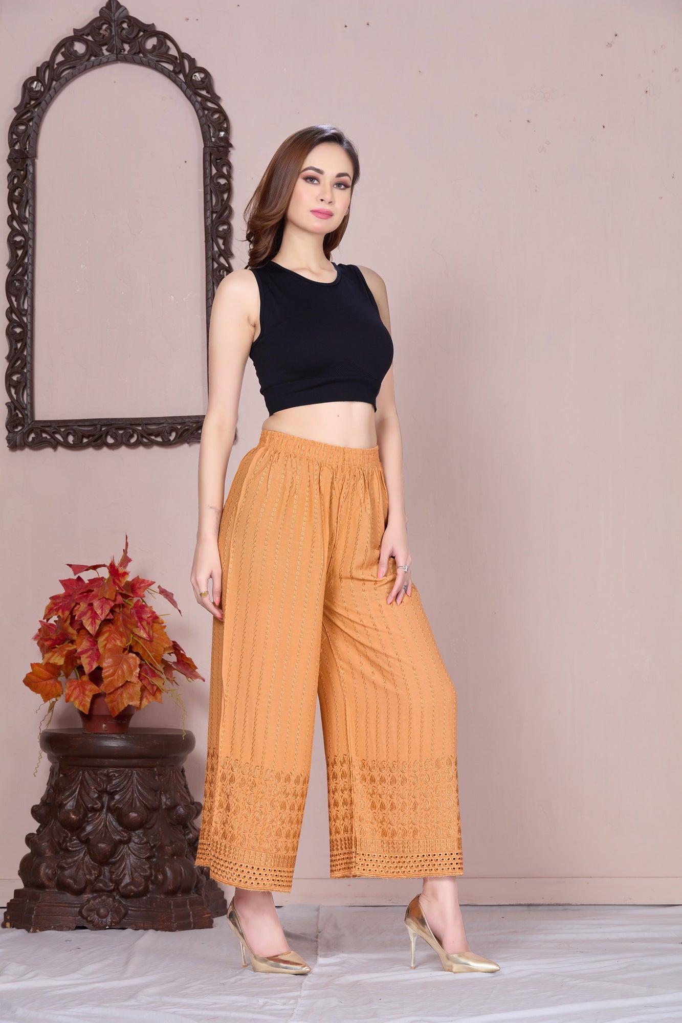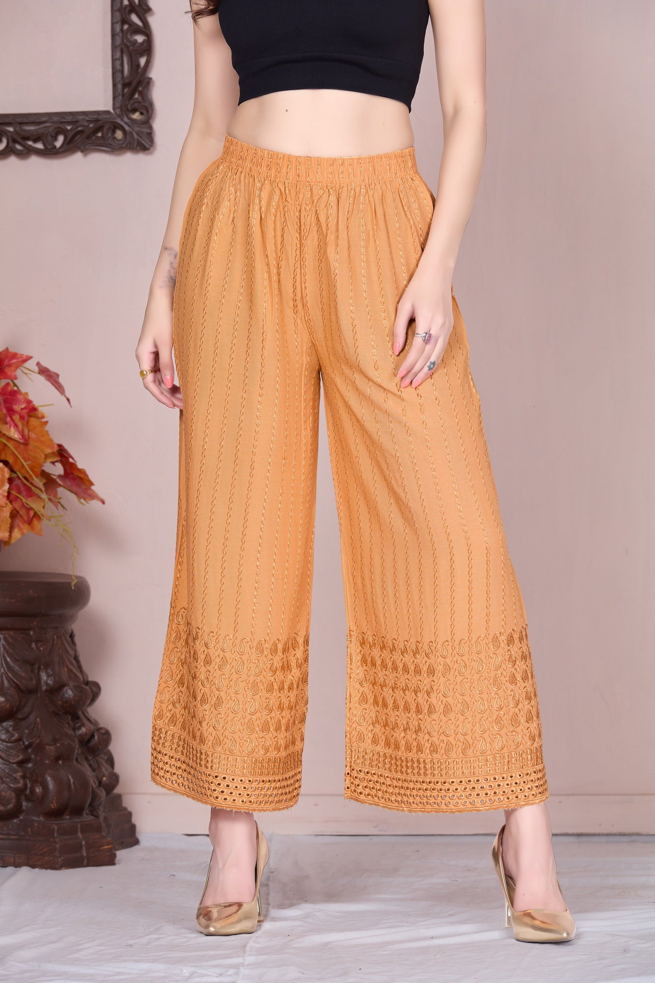Flared Dark Beige Chikan (Embroidered) Palazzo Pant