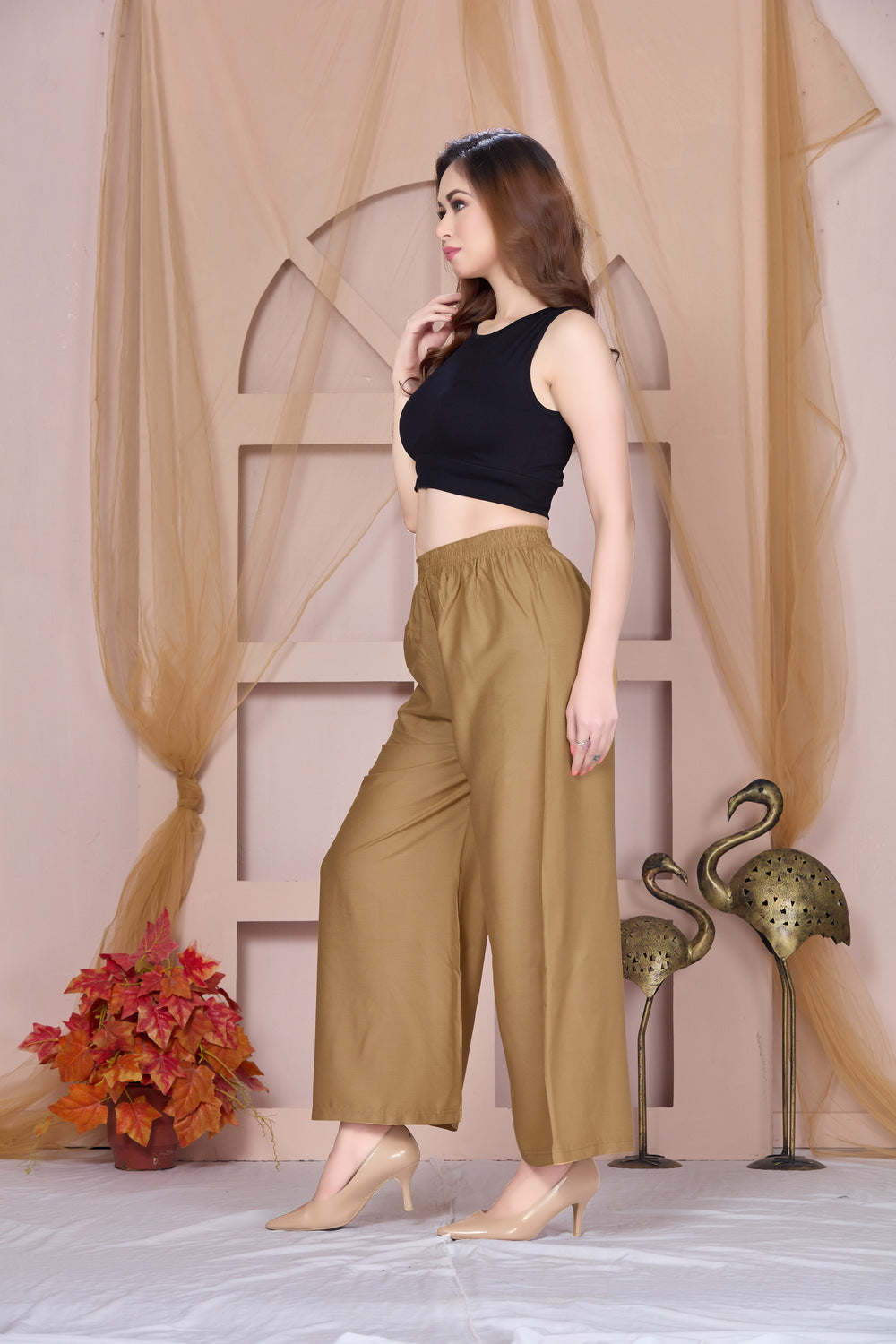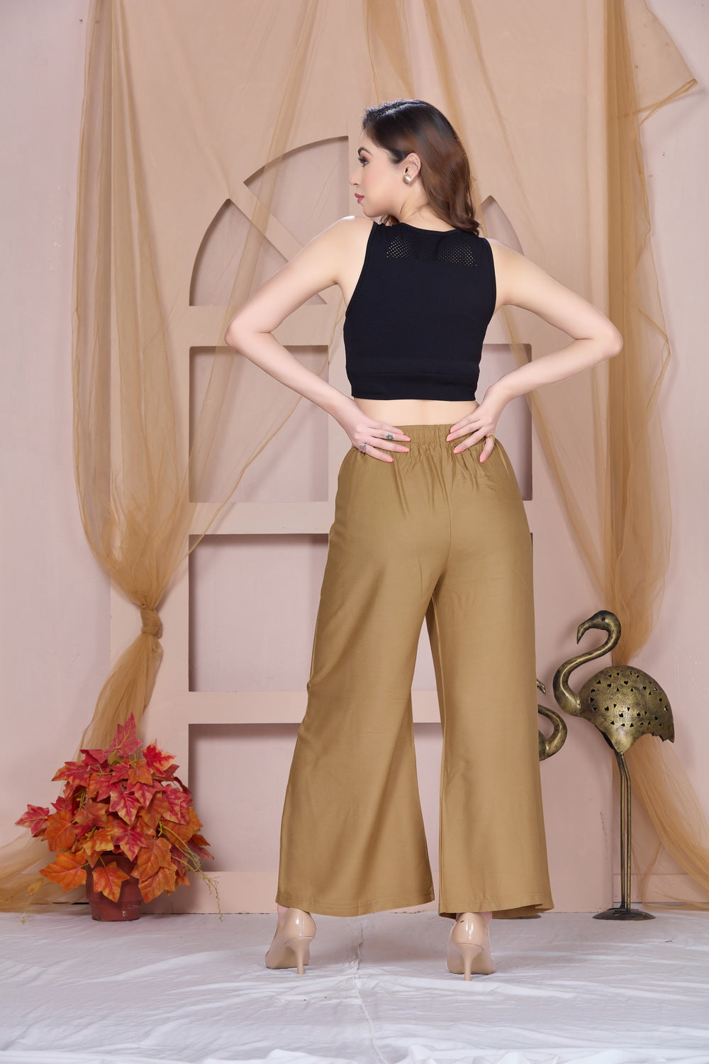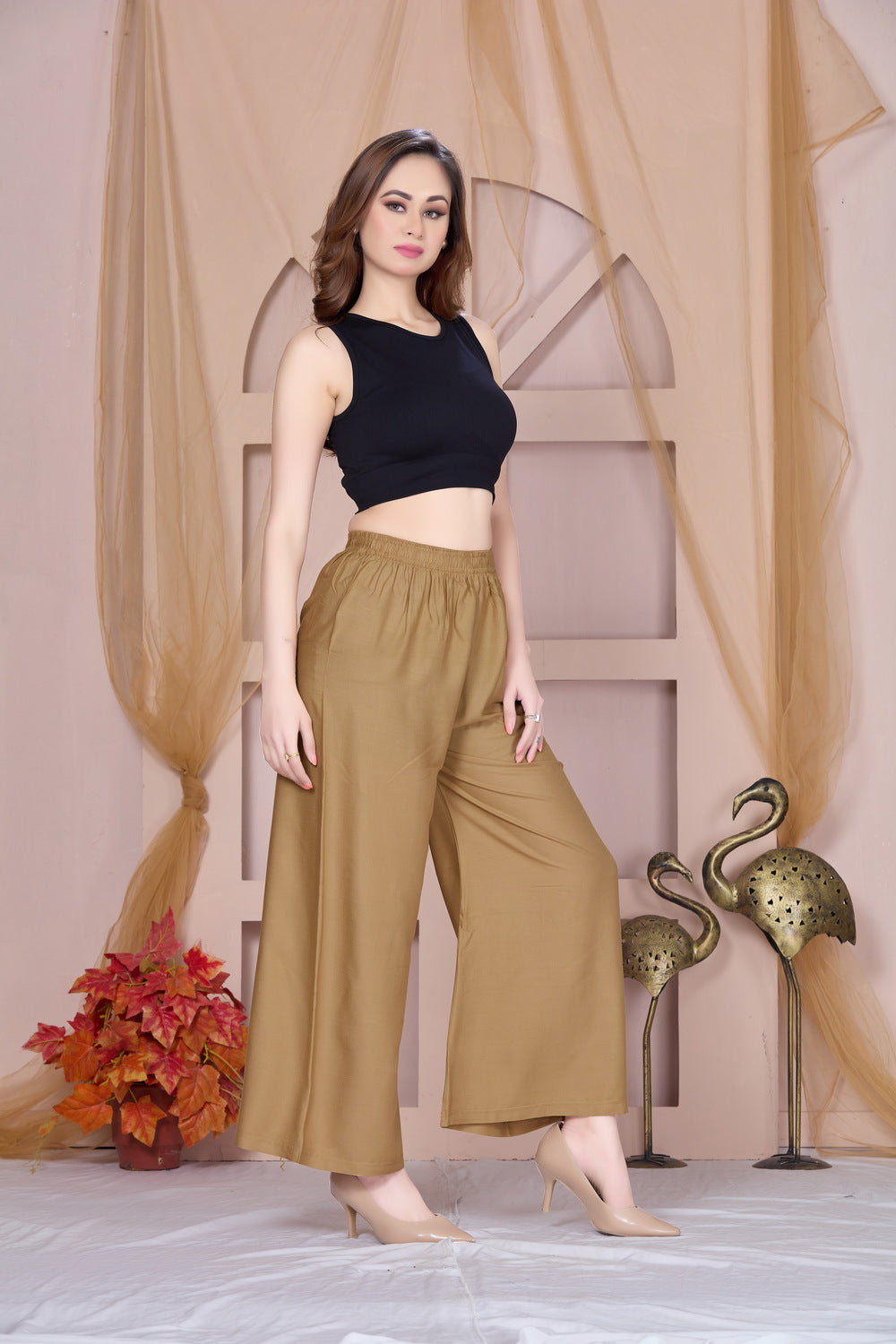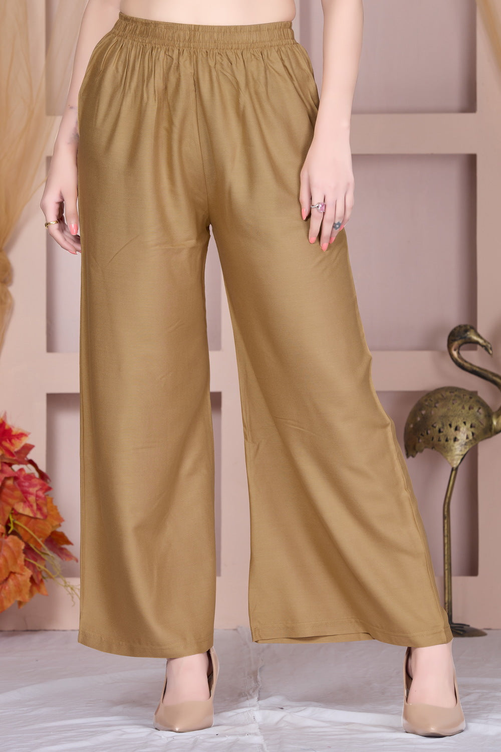 Add effortless style and comfort to your wardrobe with Vivika’s Flared Dark Beige Palazzo Pants. Made from 100% soft rayon fabric, these pants feature a classic Dark Beige color and a flared, relaxed fit that flatters all body types. The elastic waistband comfortably fits different waist sizes, offering ease of movement and all-day comfort. With an approximate length of 37 to 38 inches and one side pocket for added convenience, these palazzos are perfect for daily wear, work, travel, and festive occasions.