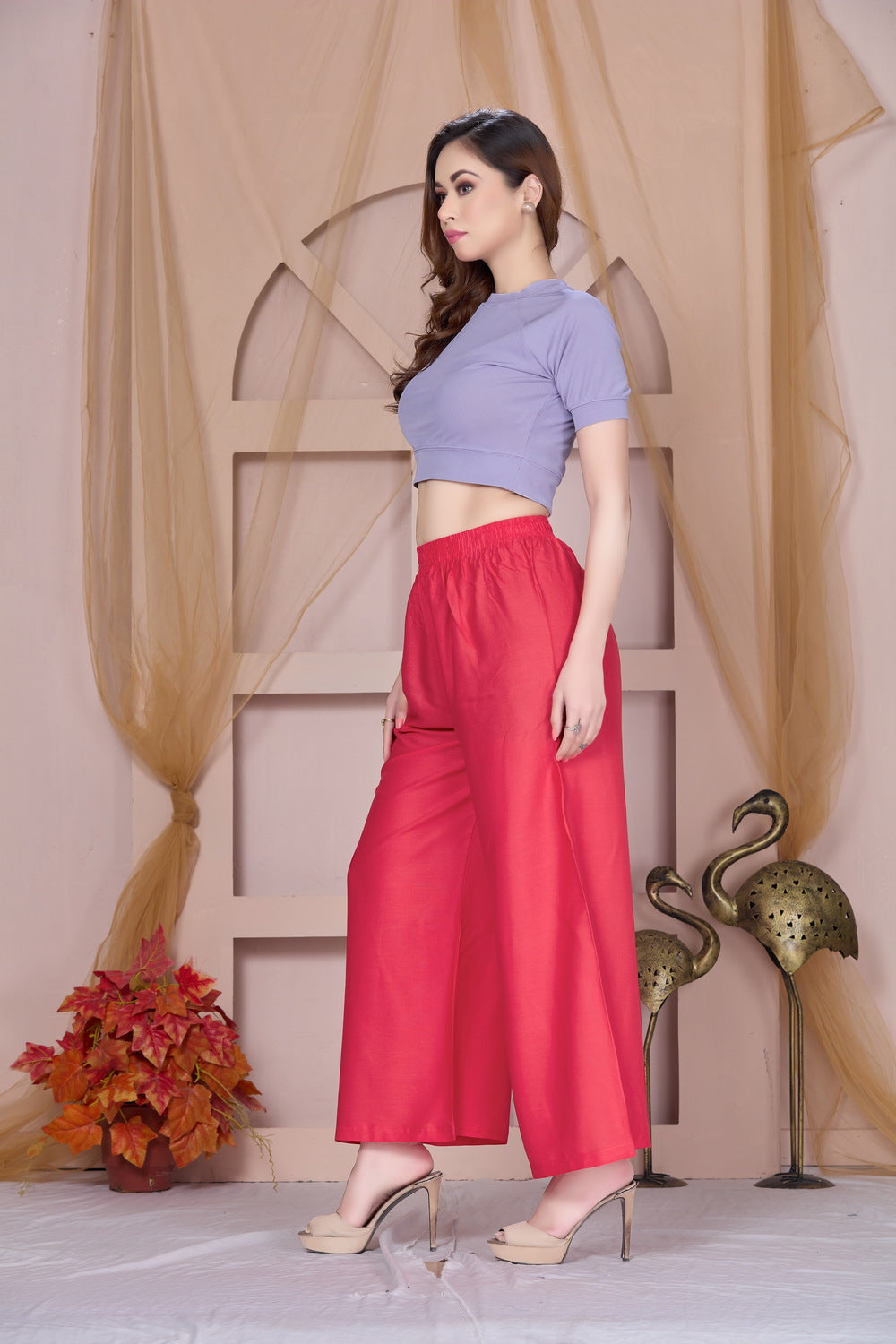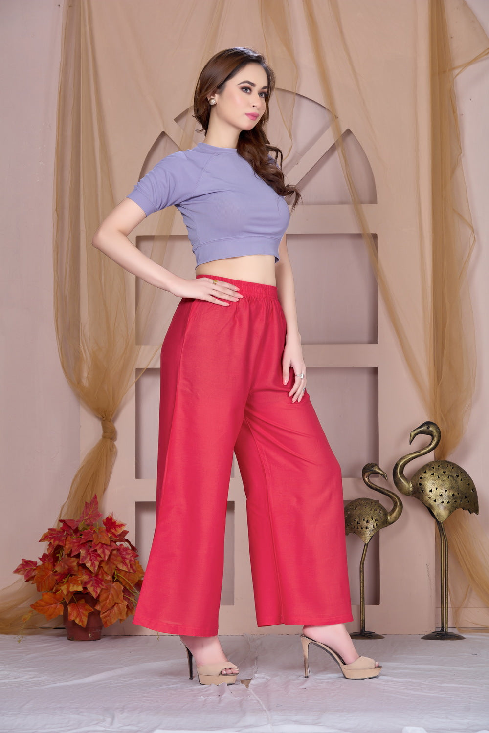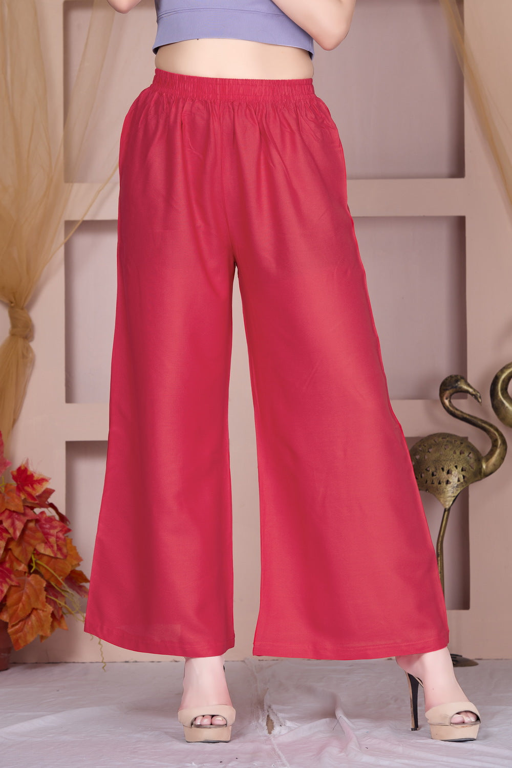 Add effortless style and comfort to your wardrobe with Vivika’s Flared Light Coral Palazzo Pants. Made from 100% soft rayon fabric, these pants feature a classic Light Coral color and a flared, relaxed fit that flatters all body types. The elastic waistband comfortably fits different waist sizes, offering ease of movement and all-day comfort. With an approximate length of 37 to 38 inches and one side pocket for added convenience, these palazzos are perfect for daily wear, work, travel, and festive occasions.