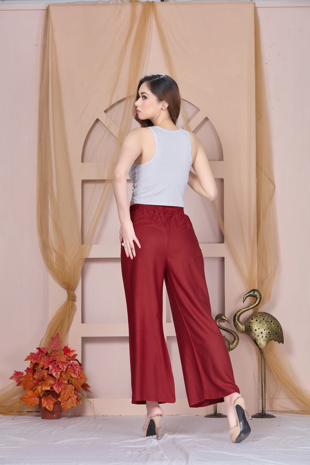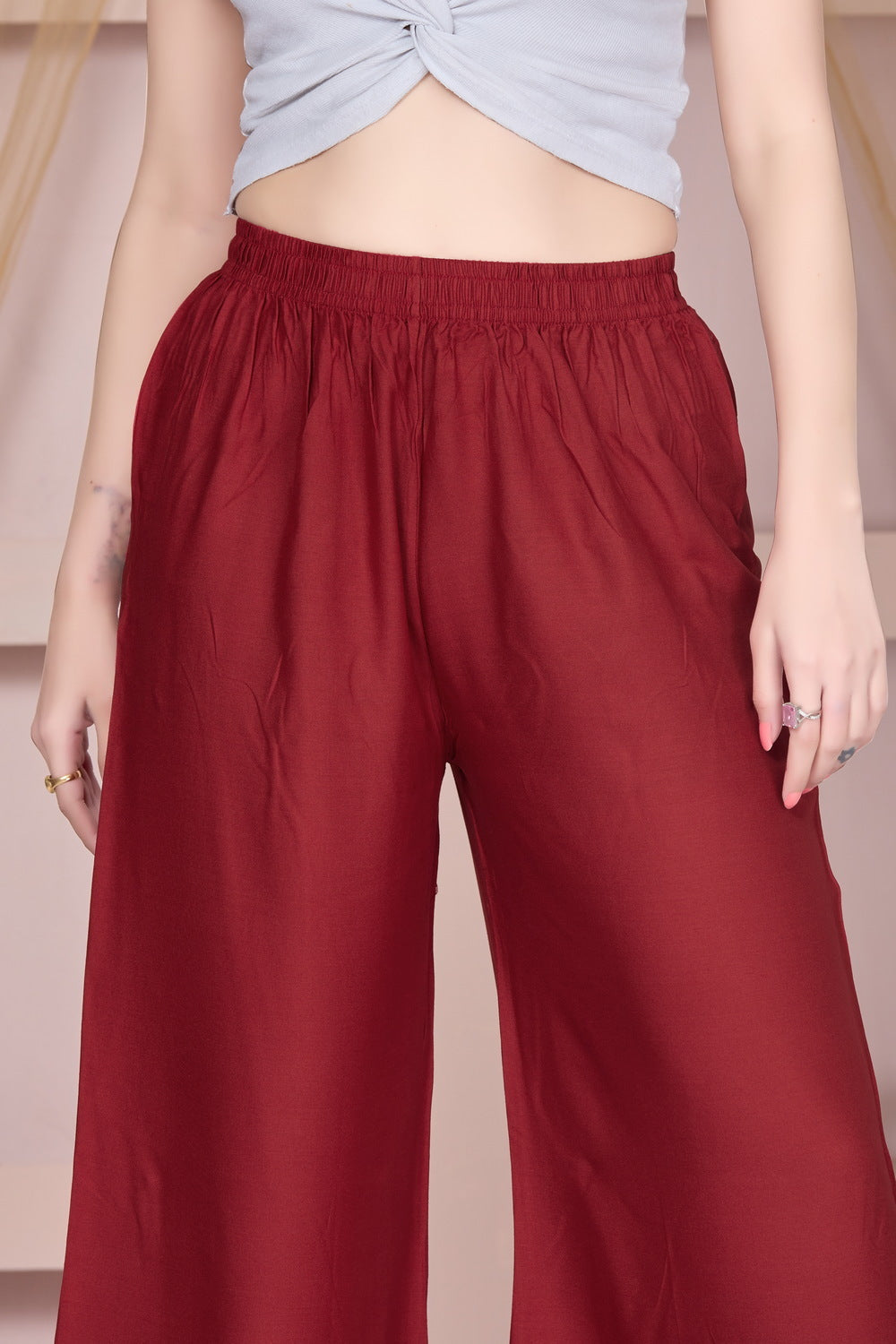 Add effortless style and comfort to your wardrobe with Vivika’s Flared Maroon Palazzo Pants. Made from 100% soft rayon fabric, these pants feature a classic Maroon color and a flared, relaxed fit that flatters all body types. The elastic waistband comfortably fits different waist sizes, offering ease of movement and all-day comfort. With an approximate length of 37 to 38 inches and one side pocket for added convenience, these palazzos are perfect for daily wear, work, travel, and festive occasions.