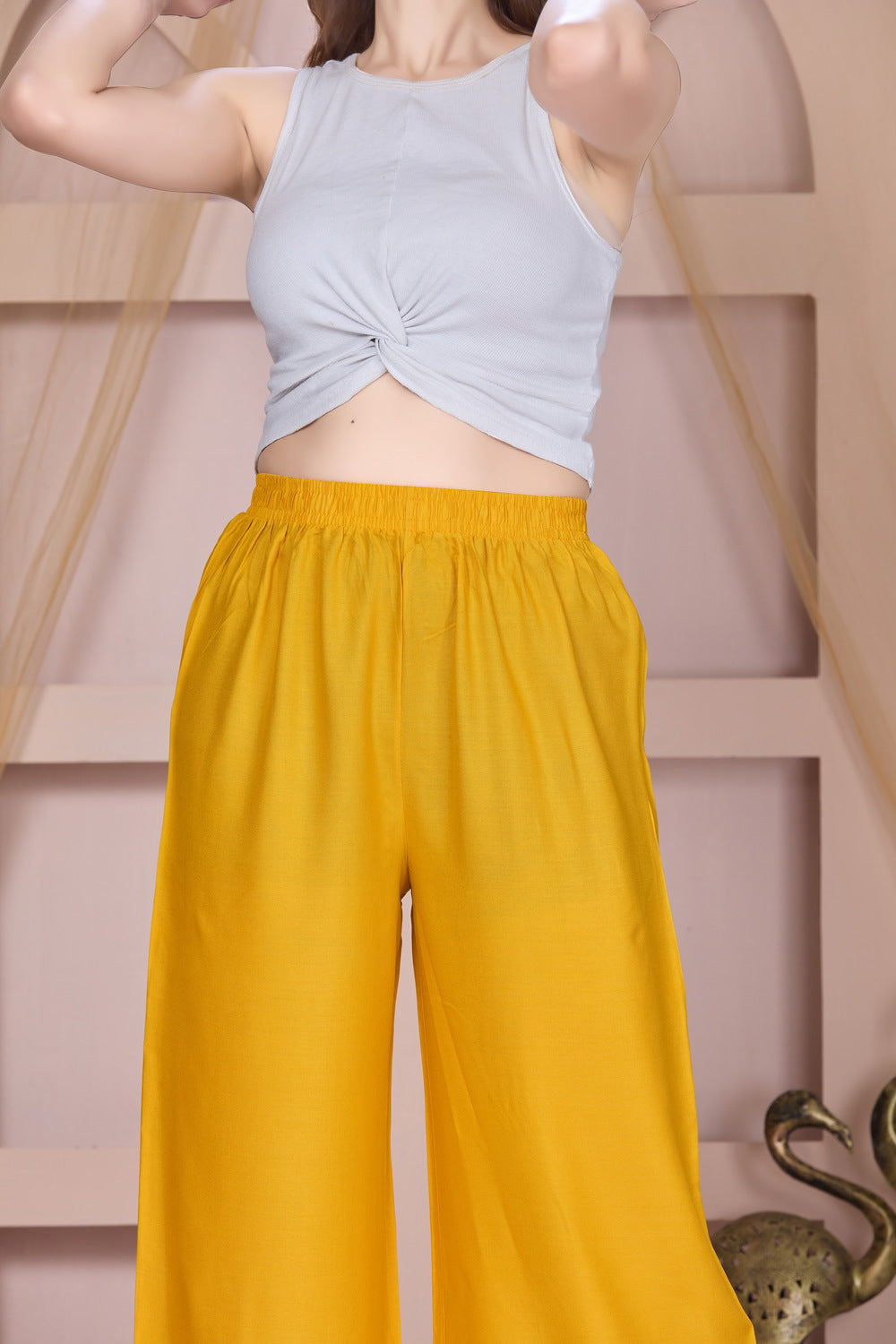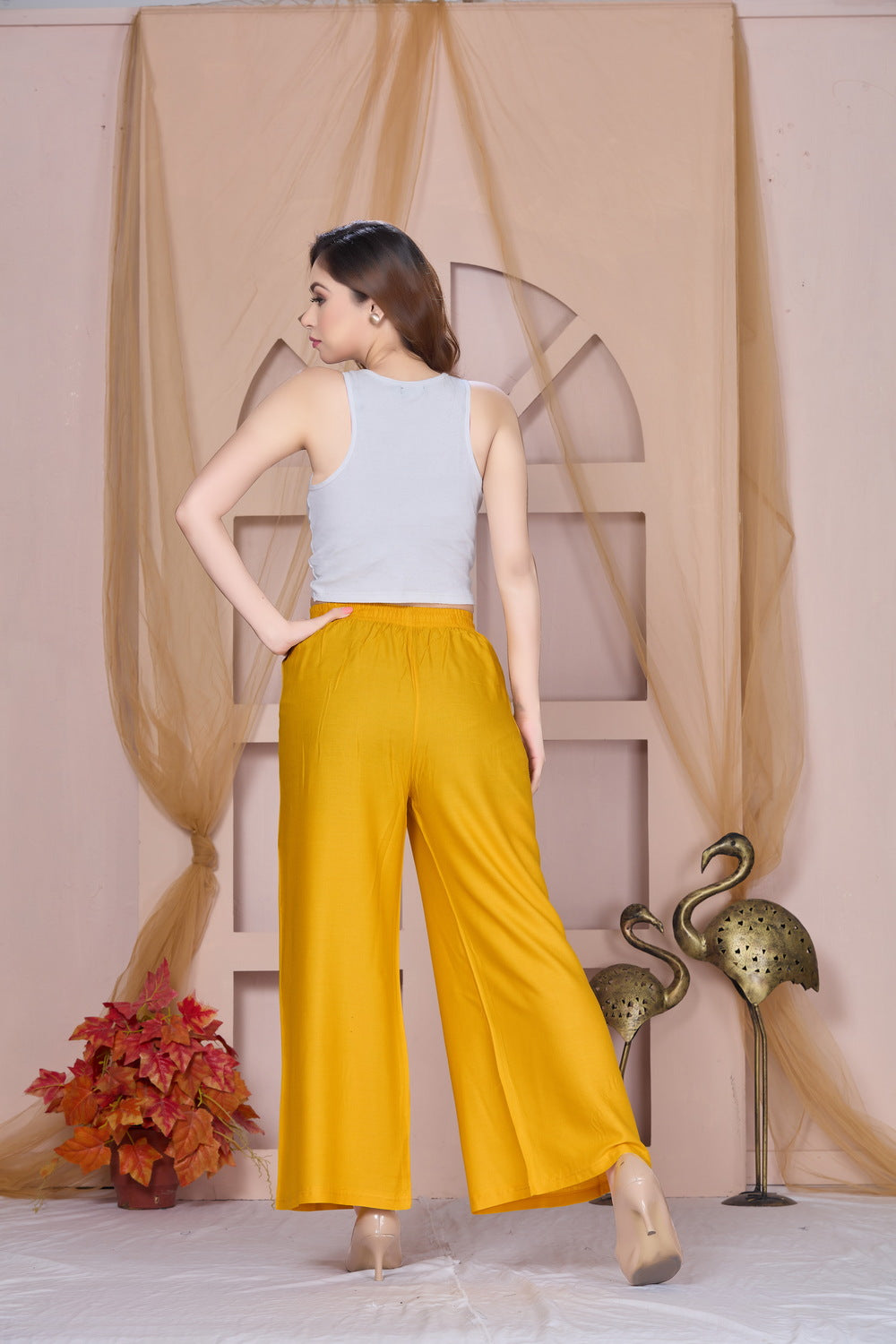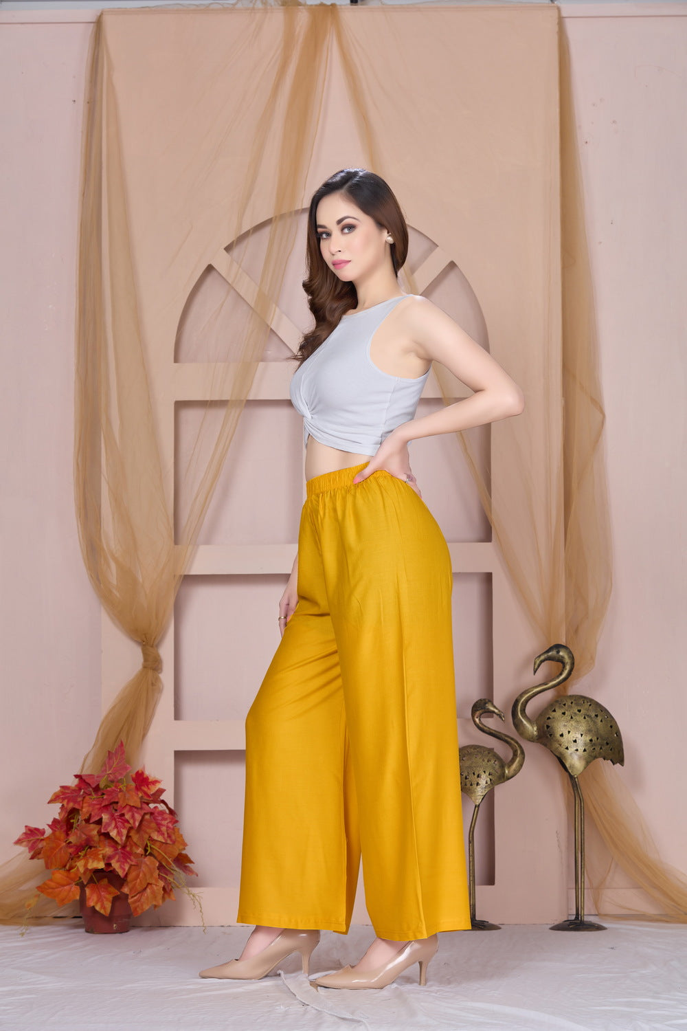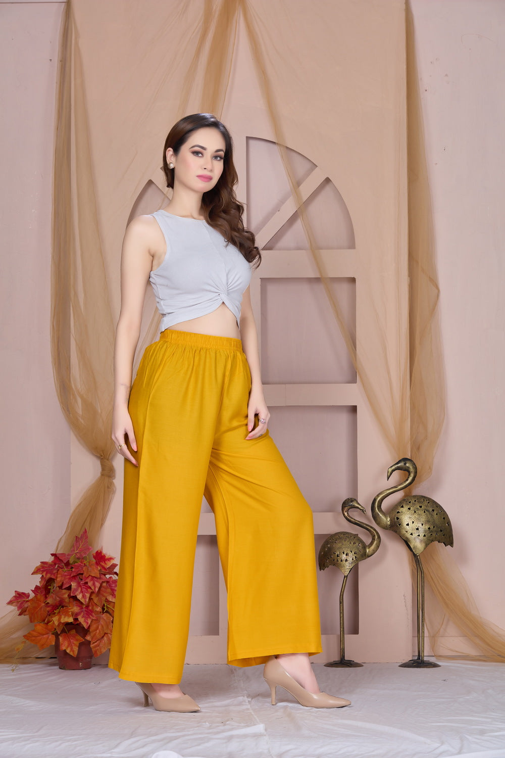 Add effortless style and comfort to your wardrobe with Vivika’s Flared Mustard Palazzo Pants. Made from 100% soft rayon fabric, these pants feature a classic Mustard color and a flared, relaxed fit that flatters all body types. The elastic waistband comfortably fits different waist sizes, offering ease of movement and all-day comfort. With an approximate length of 37 to 38 inches and one side pocket for added convenience, these palazzos are perfect for daily wear, work, travel, and festive occasions.