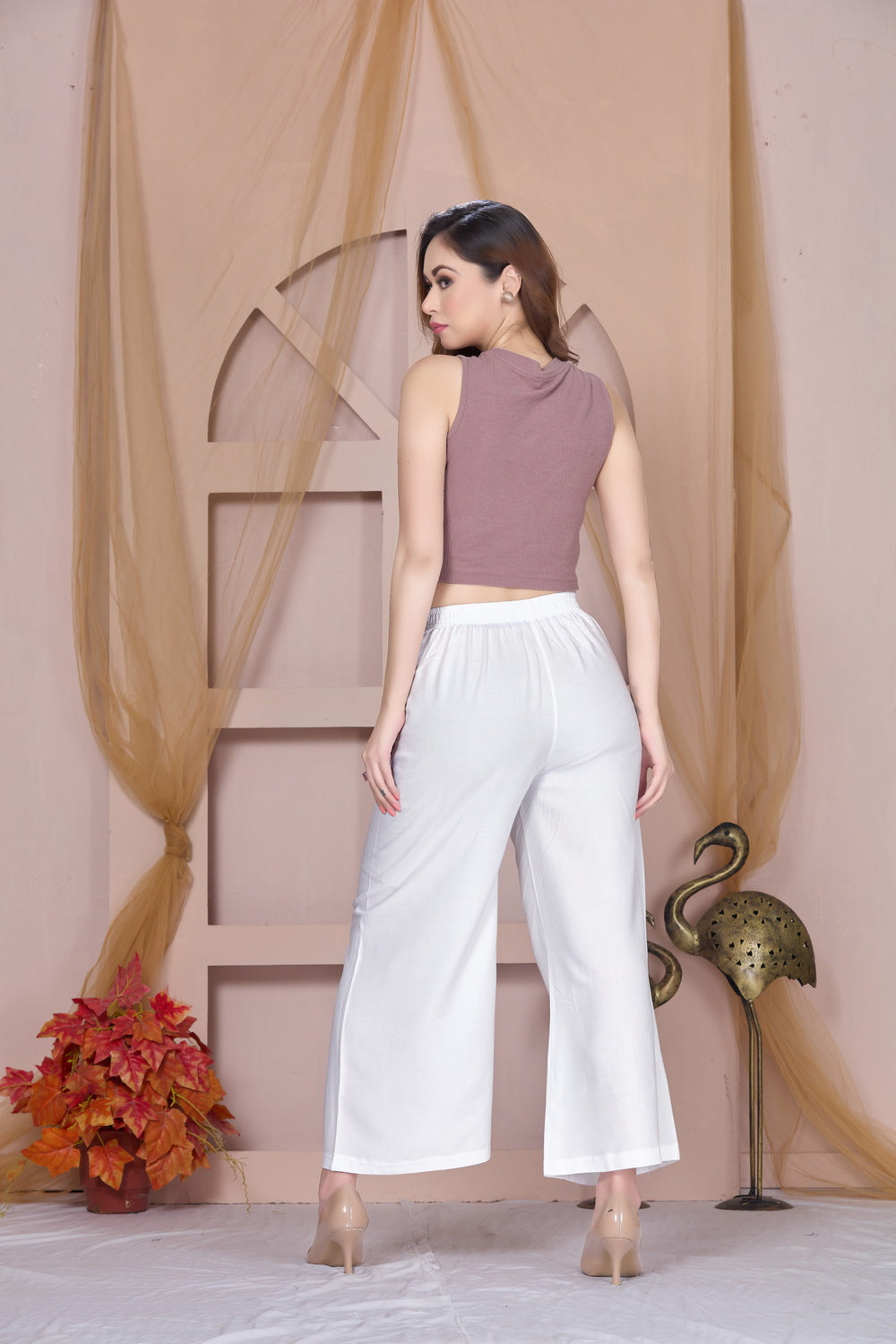 Add effortless style and comfort to your wardrobe with Vivika’s Flared White Palazzo Pants. Made from 100% soft rayon fabric, these pants feature a classic White color and a flared, relaxed fit that flatters all body types. The elastic waistband comfortably fits different waist sizes, offering ease of movement and all-day comfort. With an approximate length of 37 to 38 inches and one side pocket for added convenience, these palazzos are perfect for daily wear, work, travel, and festive occasions.