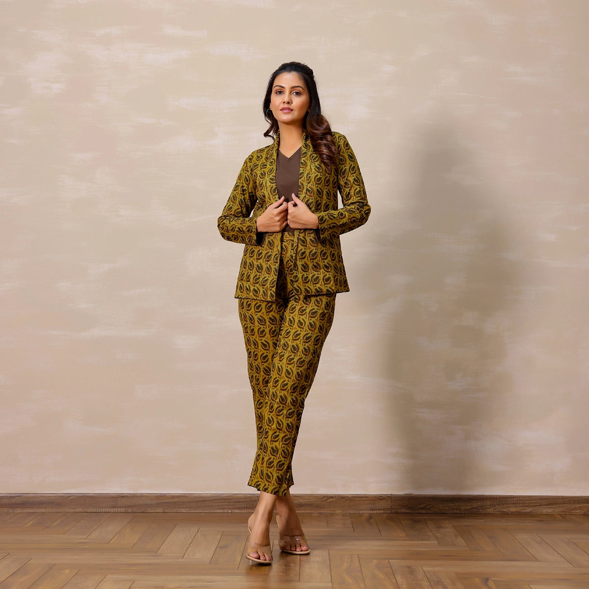 Mustard yellow Ajrakh Print Cotton Blazer set with inner