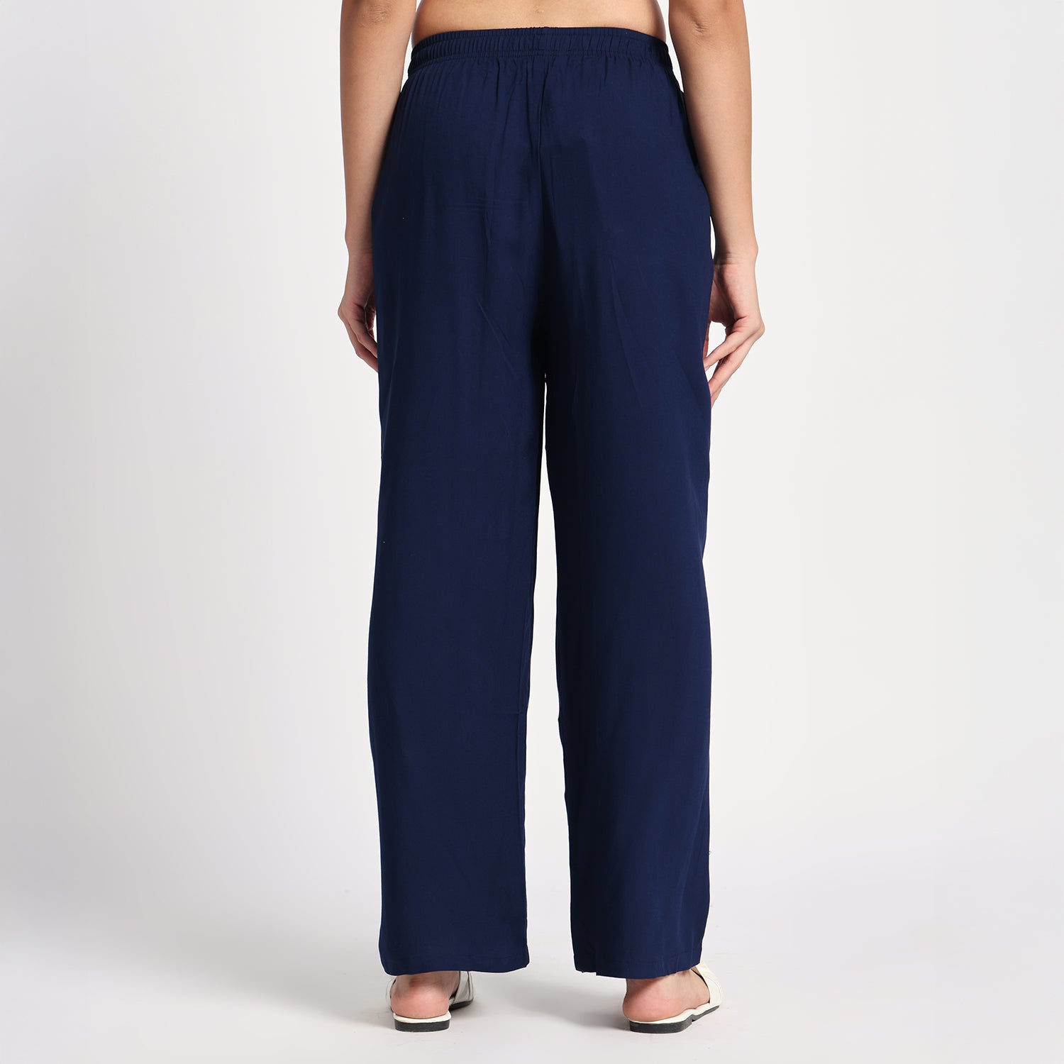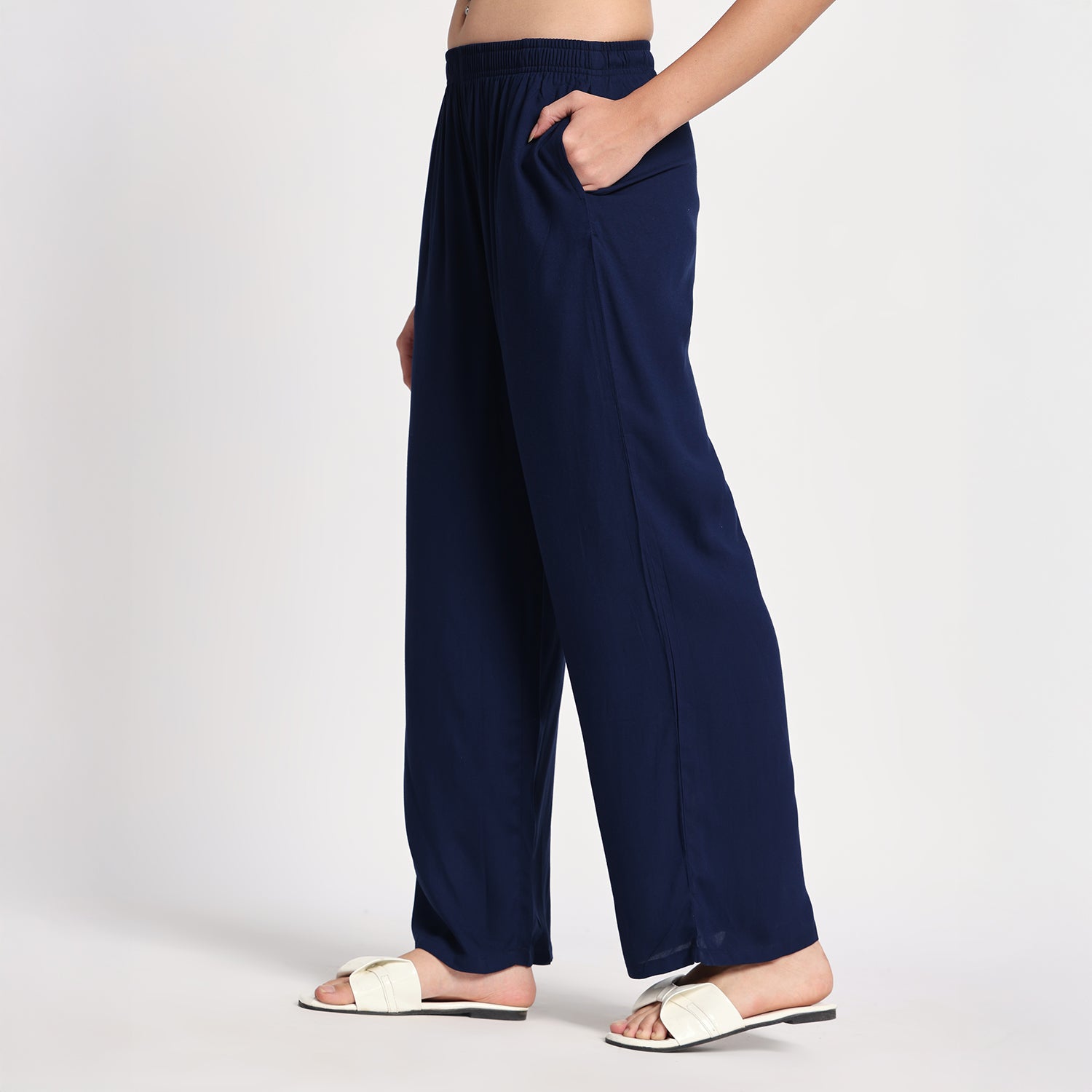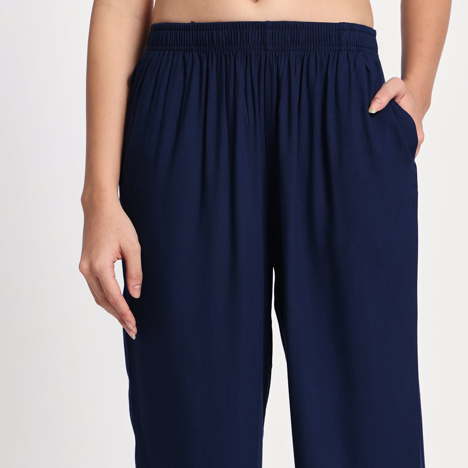 Add effortless comfort and style to your wardrobe with Vivika’s Straight Navy Blue Palazzo Pants. Made from 100% soft rayon fabric, these palazzos feature a sleek straight-fit design that flatters all body types. The stretchable elastic waistband ensures a flexible fit, while the lightweight fabric keeps you comfortable all day long. With an approximate length of 37 to 37.5 inches, these palazzos are perfect for daily wear, office, travel, and festive occasions.