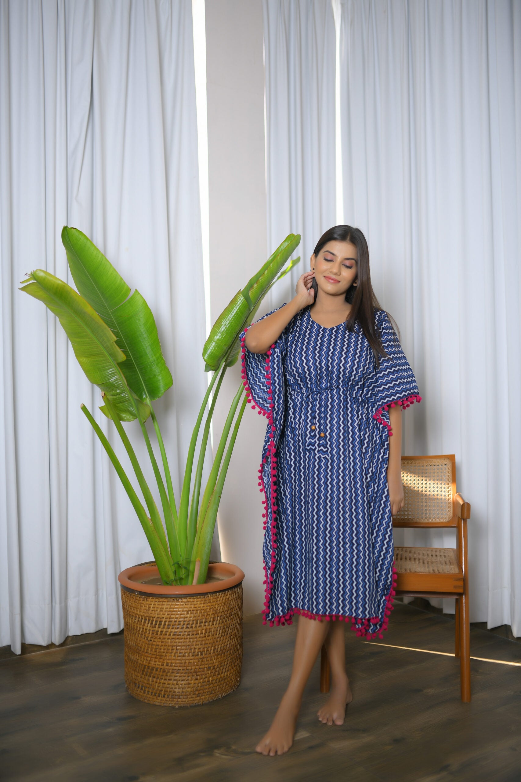 Stay relaxed and cozy when you lounge around in our ajrakh printed short kaftan. Loose-fitting Cotton kaftan crafted with beautiful prints, soft and delicate touch is perfect for your next vacation or pool party. With a loose-fitting design, this dress will allow you to move with ease and comfort. The embedded drawstring waist allows it to fit to all unique sizes.
