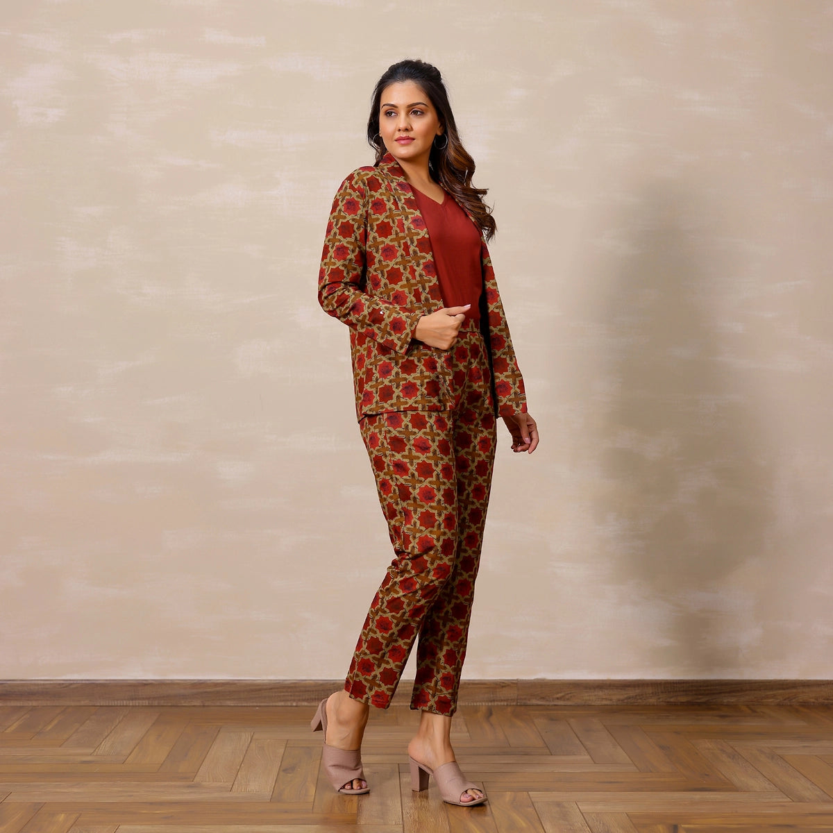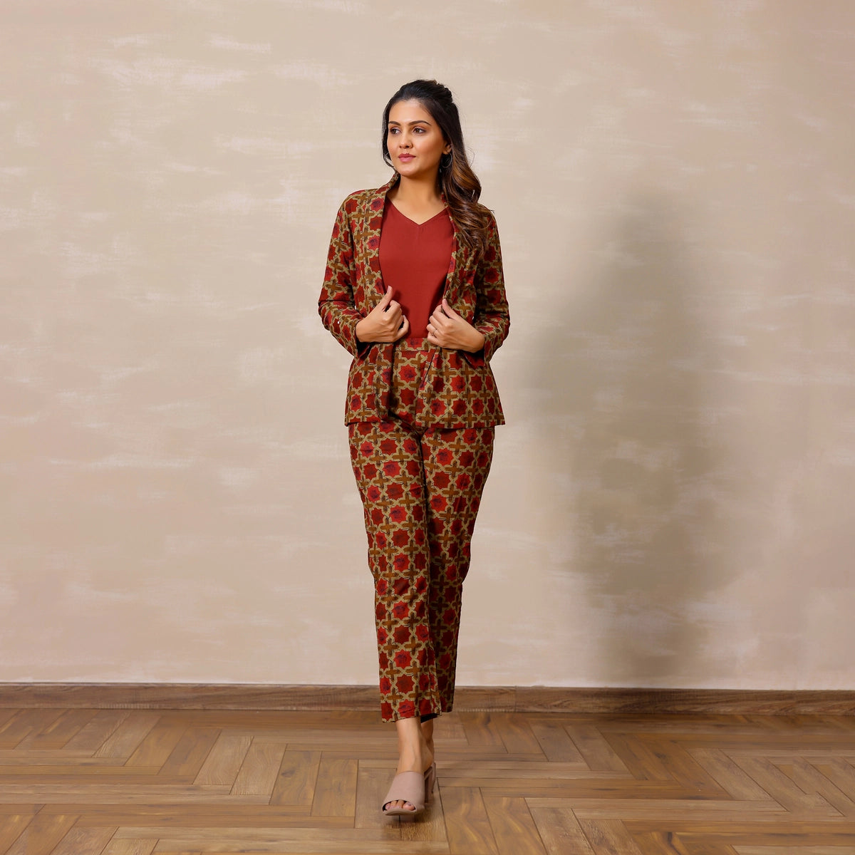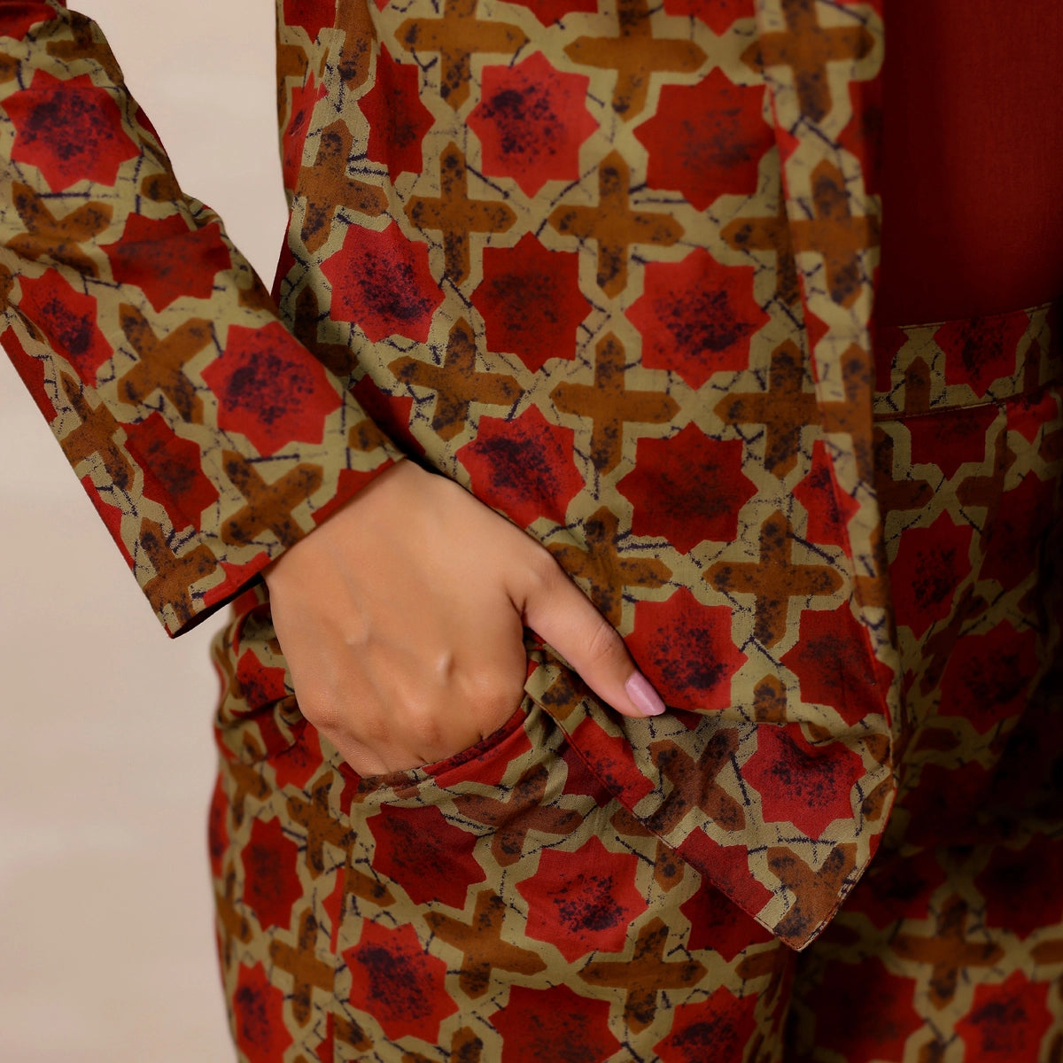 Red and Beige Ajrakh Print Cotton Blazer set with Inner
