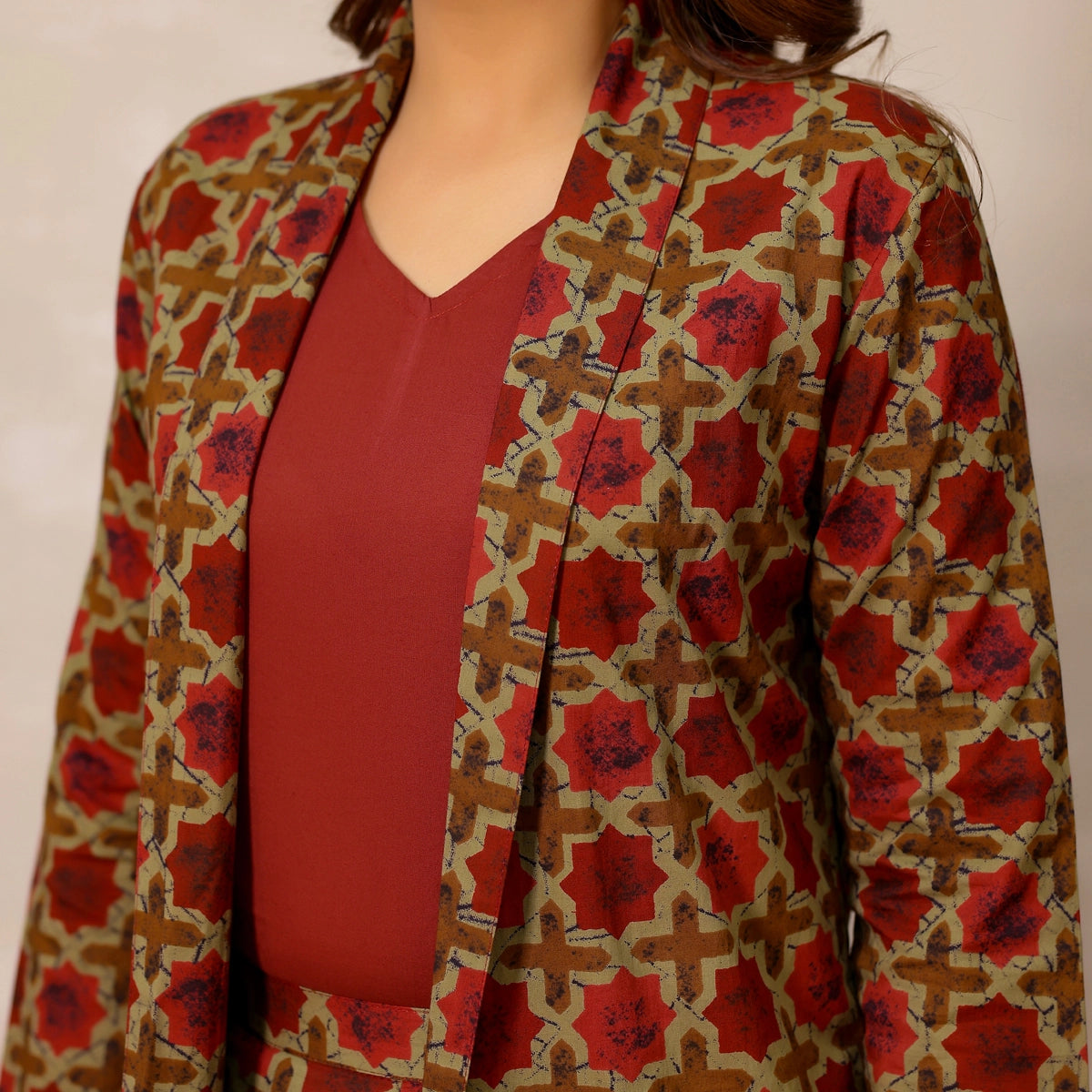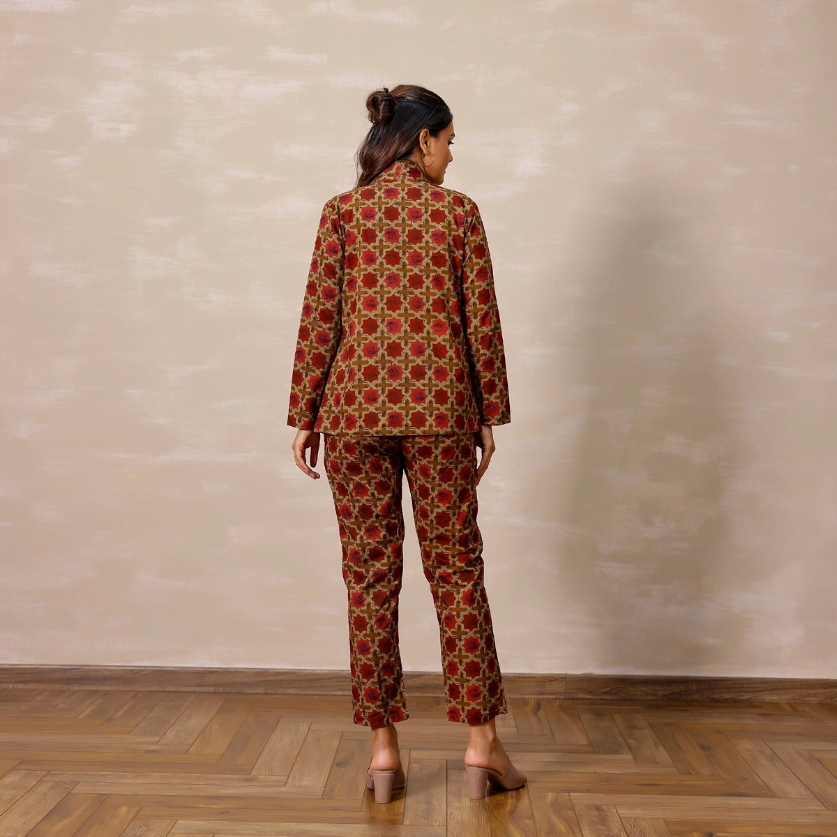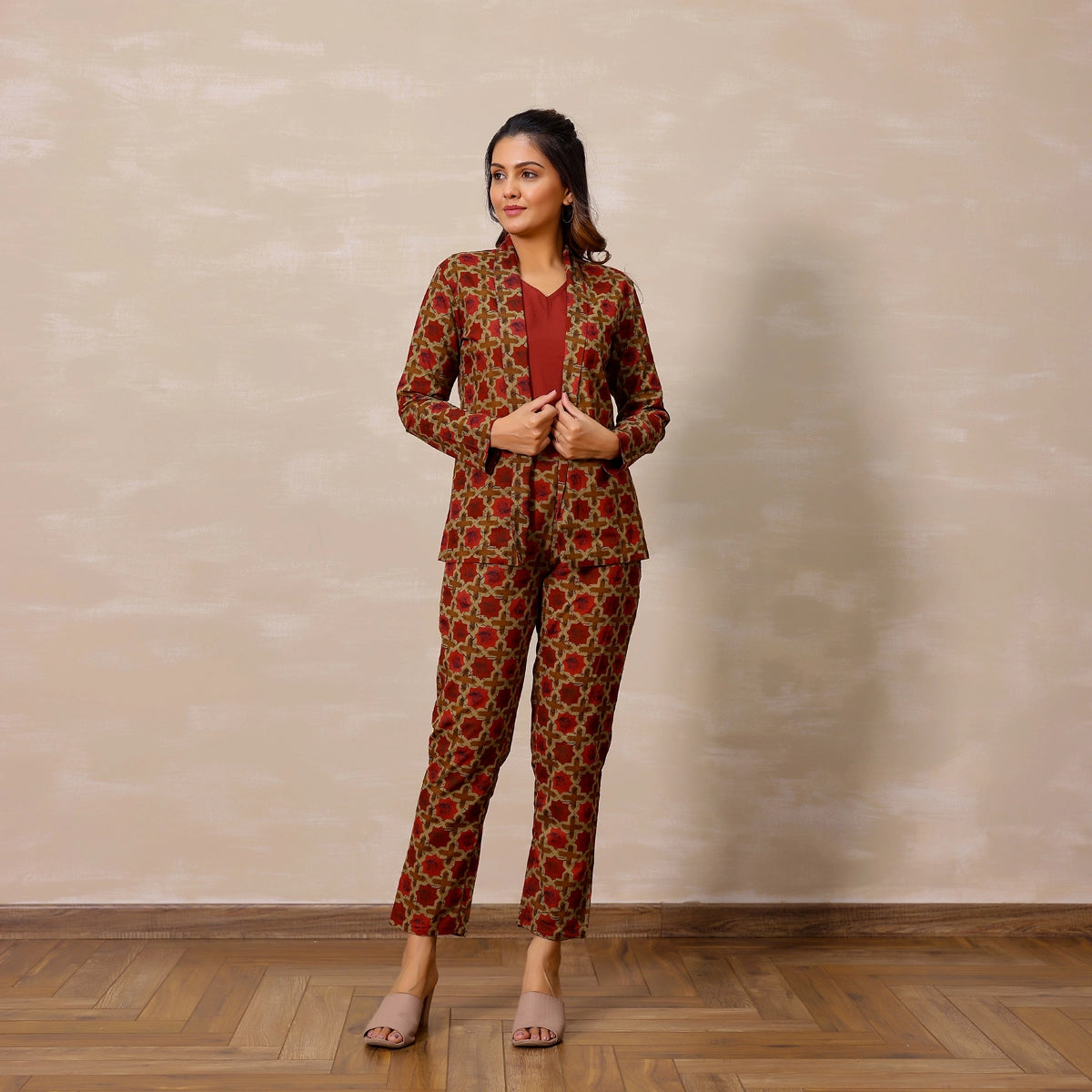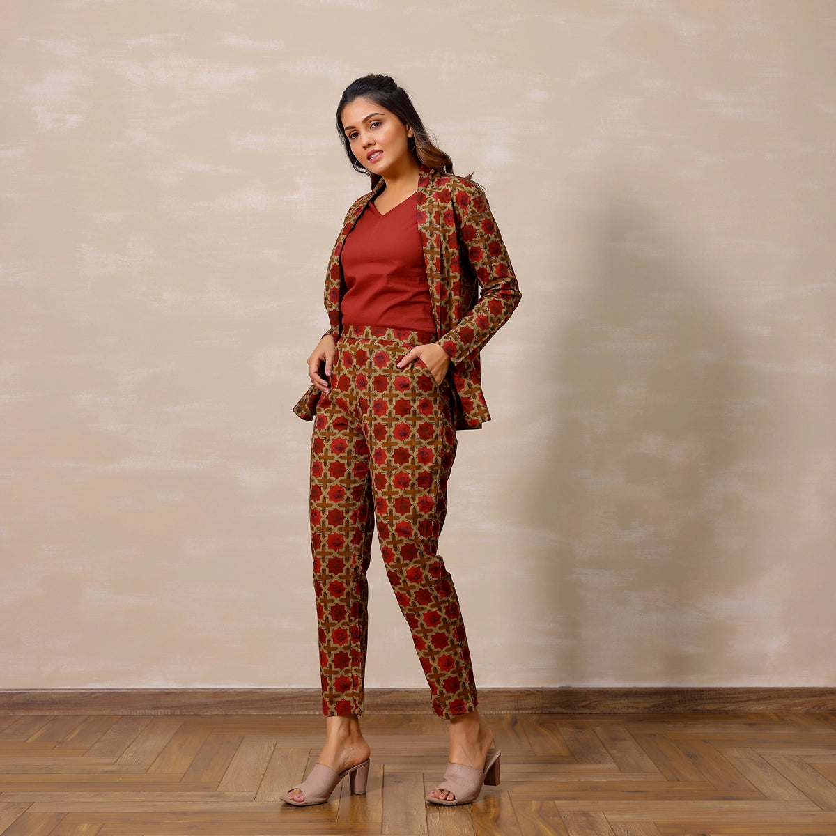 Red and Beige Ajrakh Print Cotton Blazer set with Inner