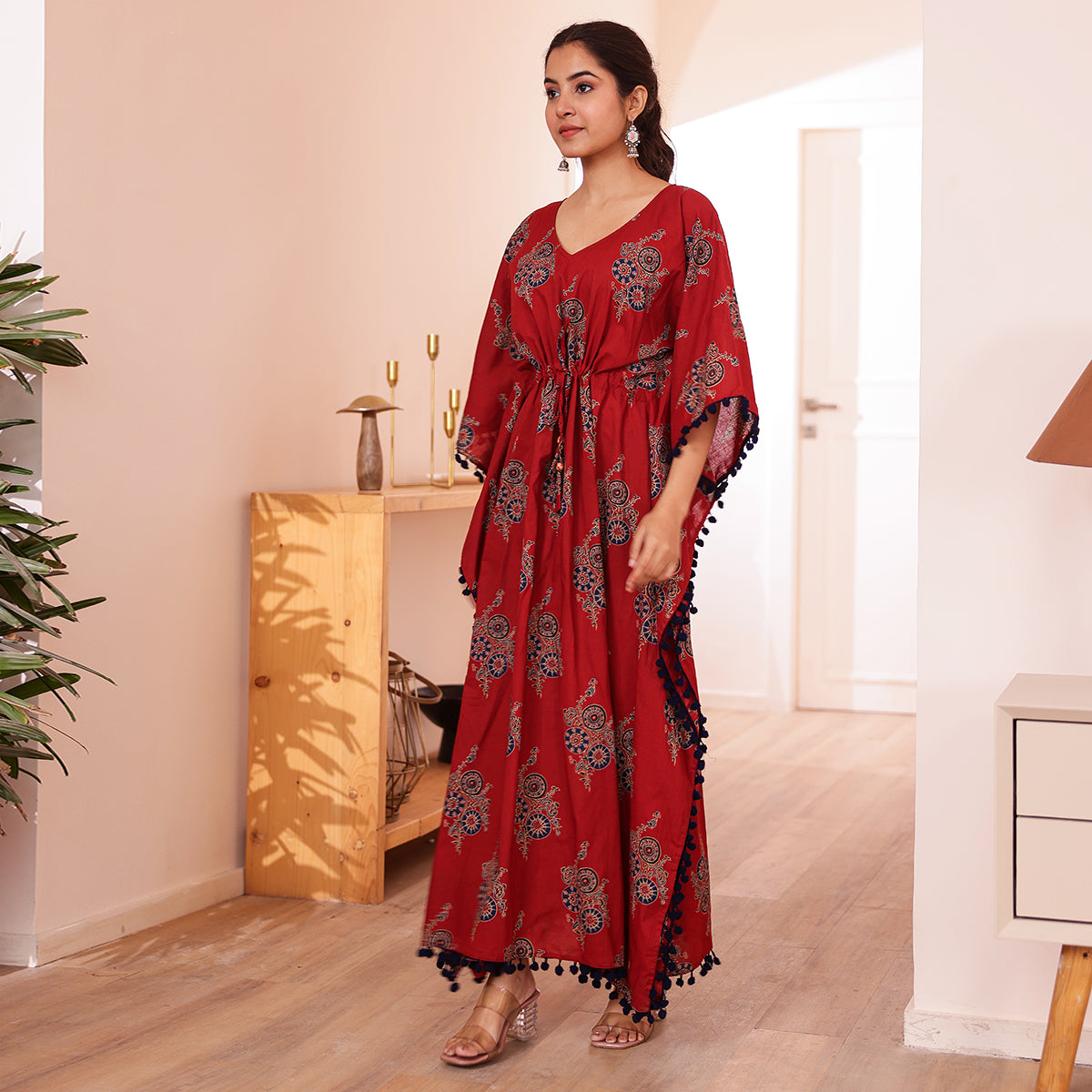 Slip into easy elegance with this Maroon Motif Printed Long Kaftan with Navy Pom-Pom Lace. Made for relaxed days and effortless dressing, this kaftan features a beautiful all-over motif print and a soft, flowy silhouette that feels as good as it looks. The adjustable drawstring waist lets you customize the fit, while the contrast pom-pom lace adds a charming, playful touch.