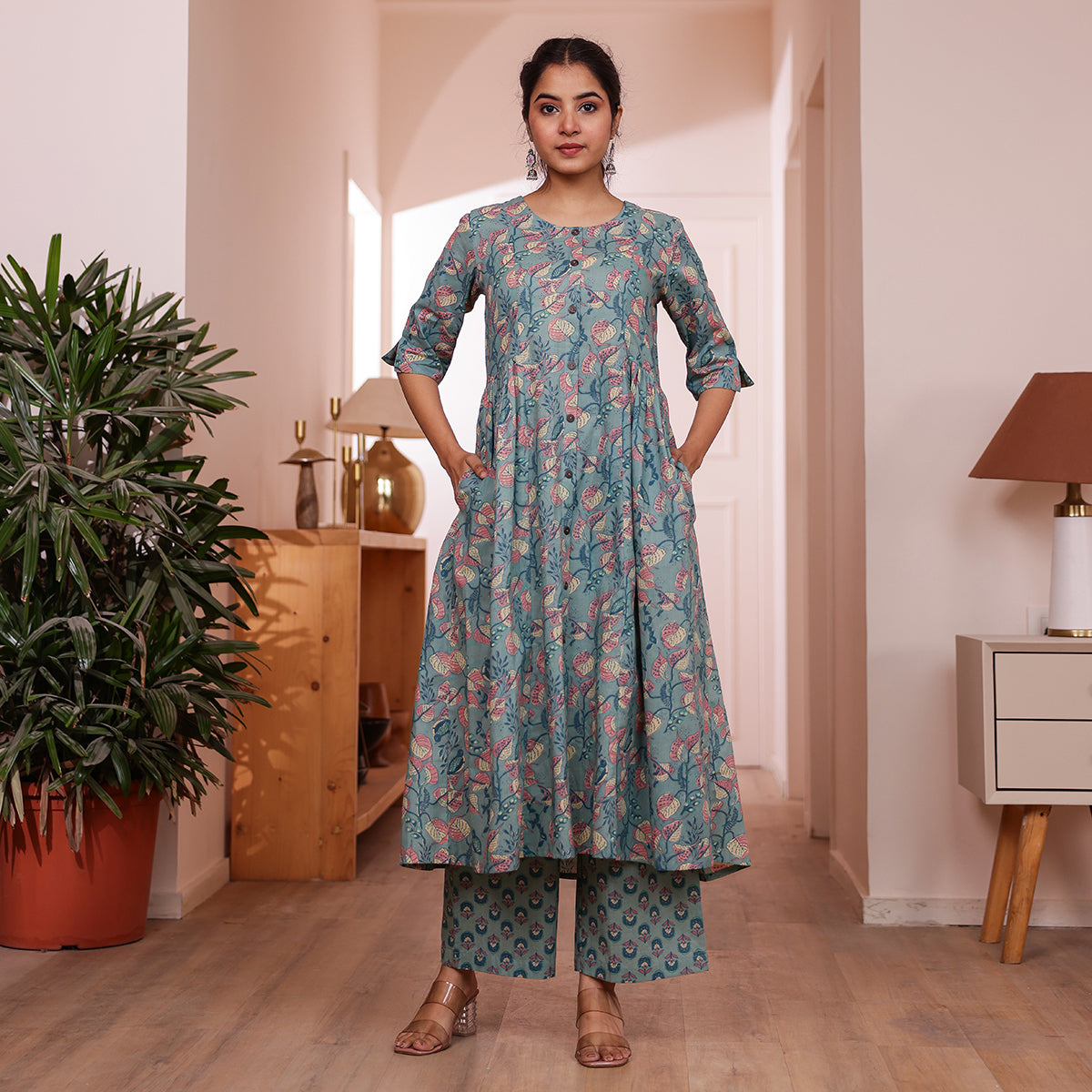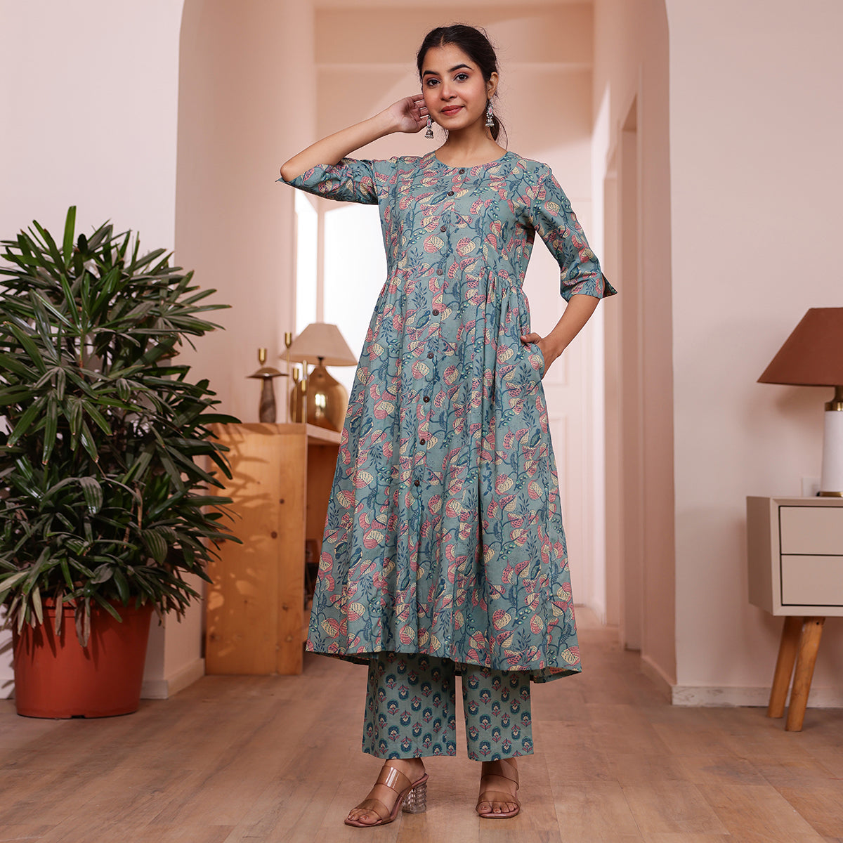Teal Green Veil Printed Cotton Co-ord Set