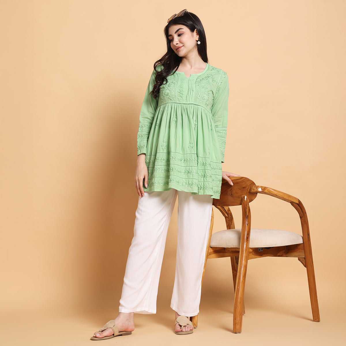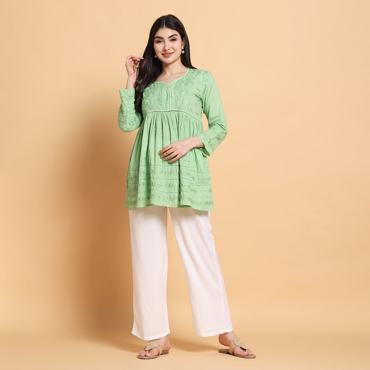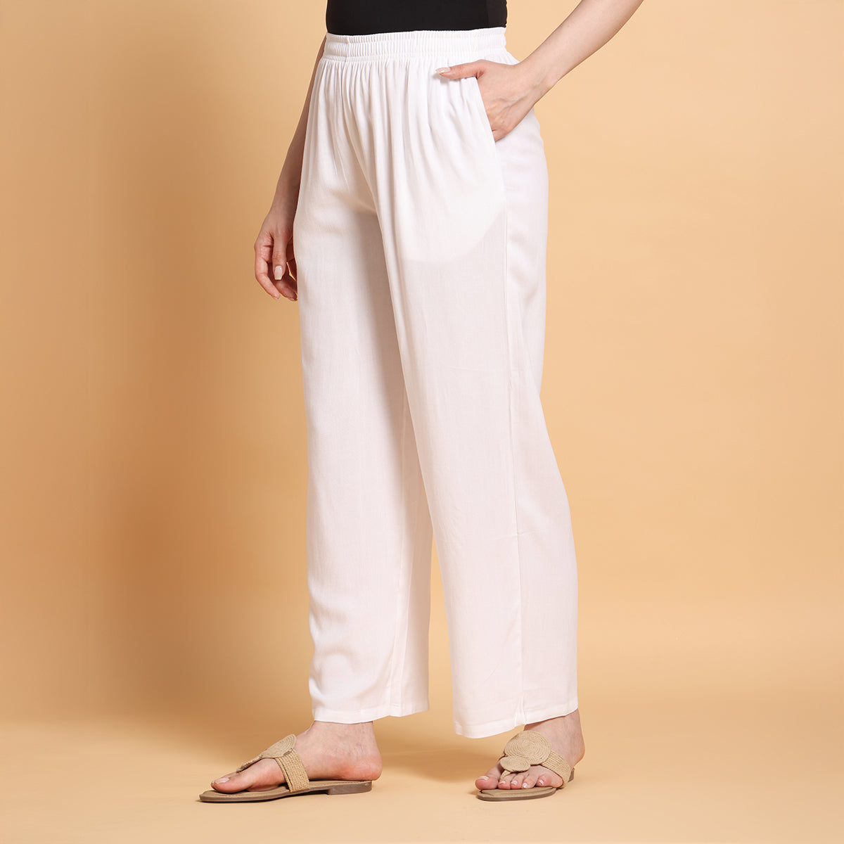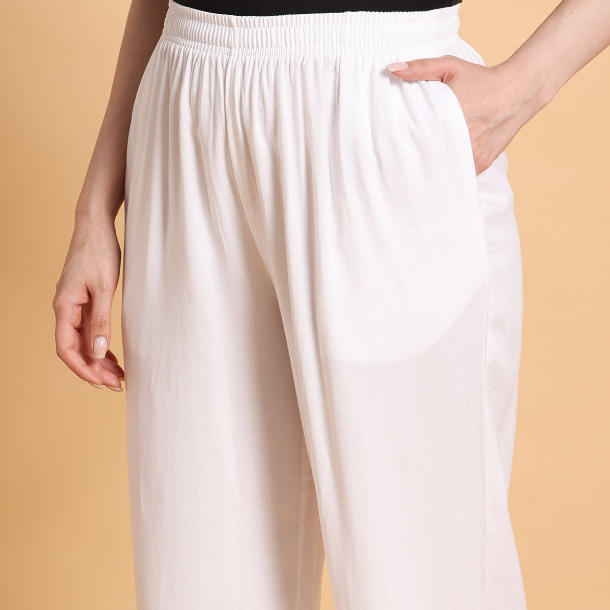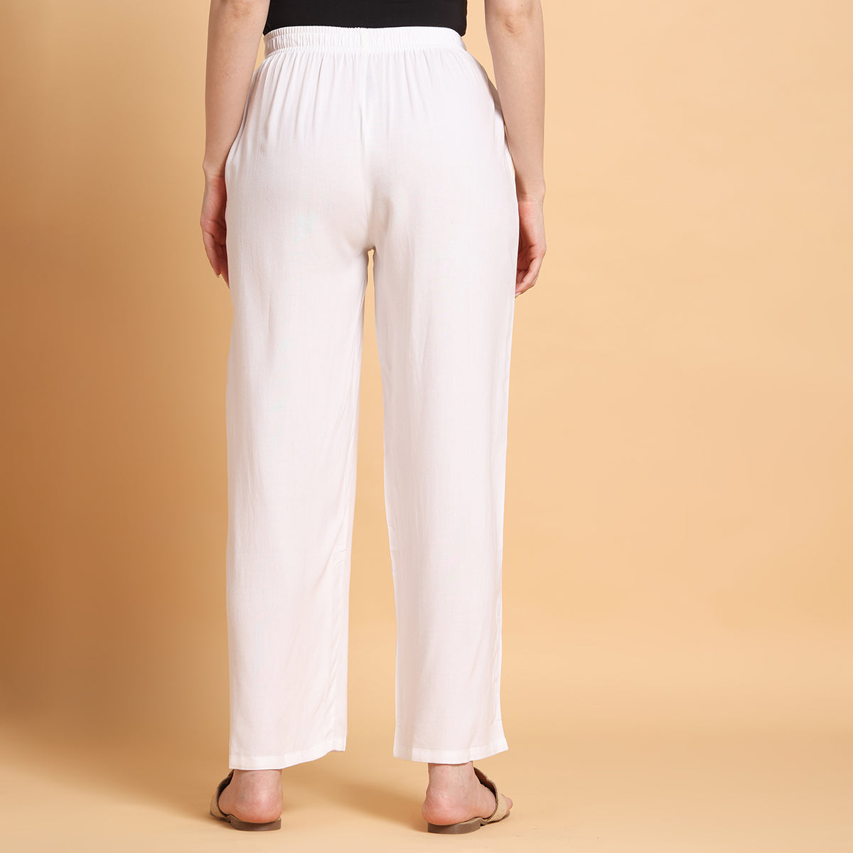 Add effortless comfort and style to your wardrobe with Vivika’s Straight White Palazzo Pants. Made from 100% soft rayon fabric, these palazzos feature a sleek straight-fit design that flatters all body types. The stretchable elastic waistband ensures a flexible fit, while the lightweight fabric keeps you comfortable all day long. With an approximate length of 37 to 37.5 inches, these palazzos are perfect for daily wear, office, travel, and festive occasions.